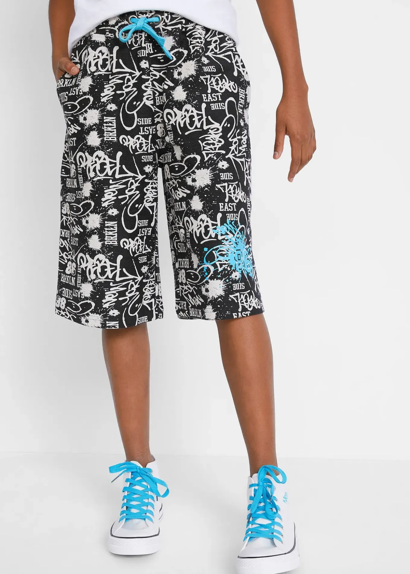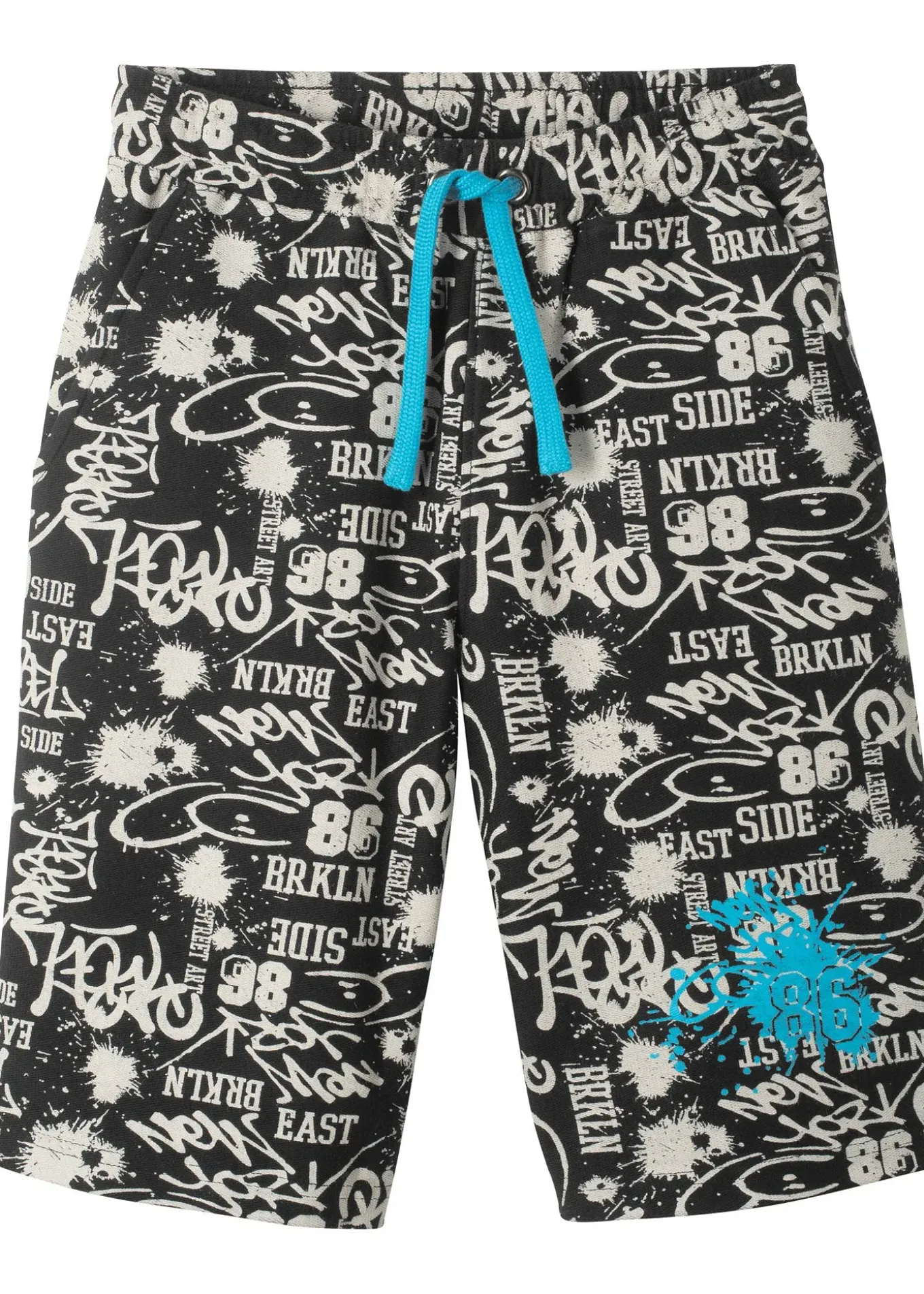 Bermuda décontracté en molleton imprimé et texturé. Taille élastiquée avec cordon contrastant.