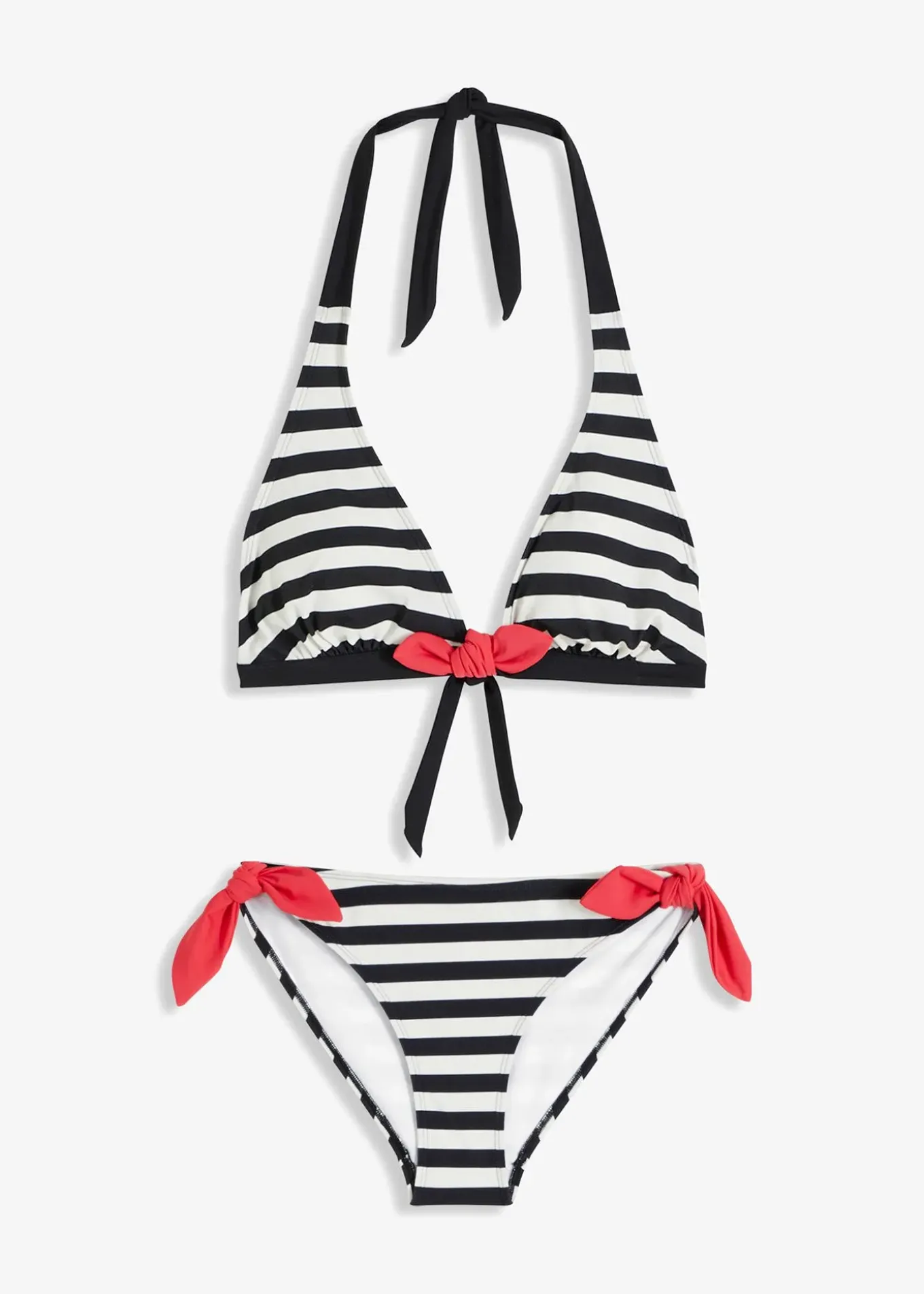 Bretelles à nouer dans le cou. Avec doublure poitrine et coques souples amovibles. Liens à nouer dans le dos. Bas de maillot avec liens fantaisie sur les côtés. Doublé. Convient jusqu’au bon. B.