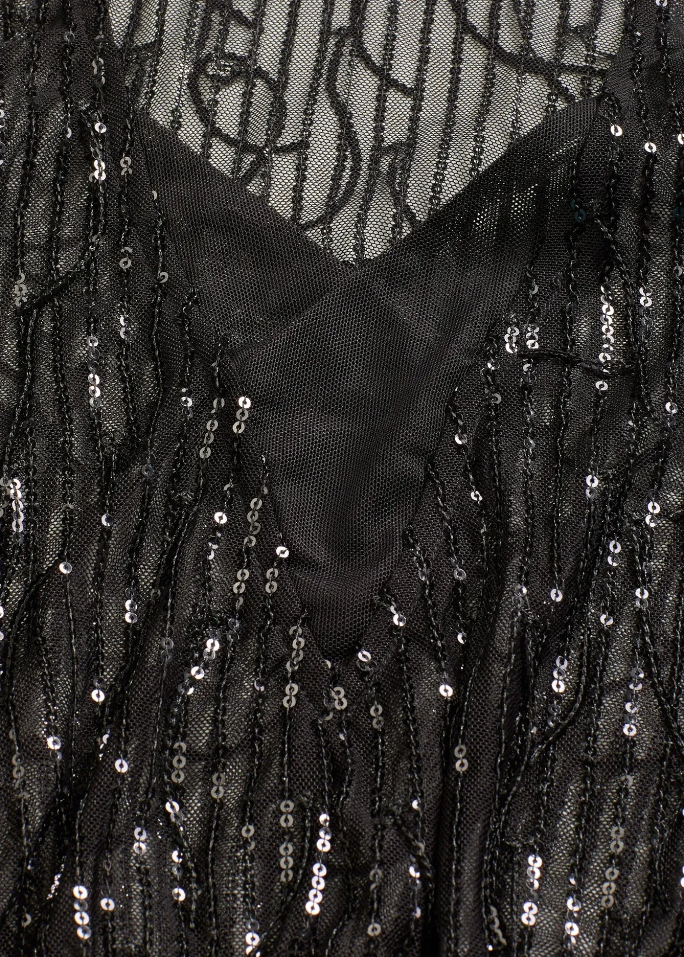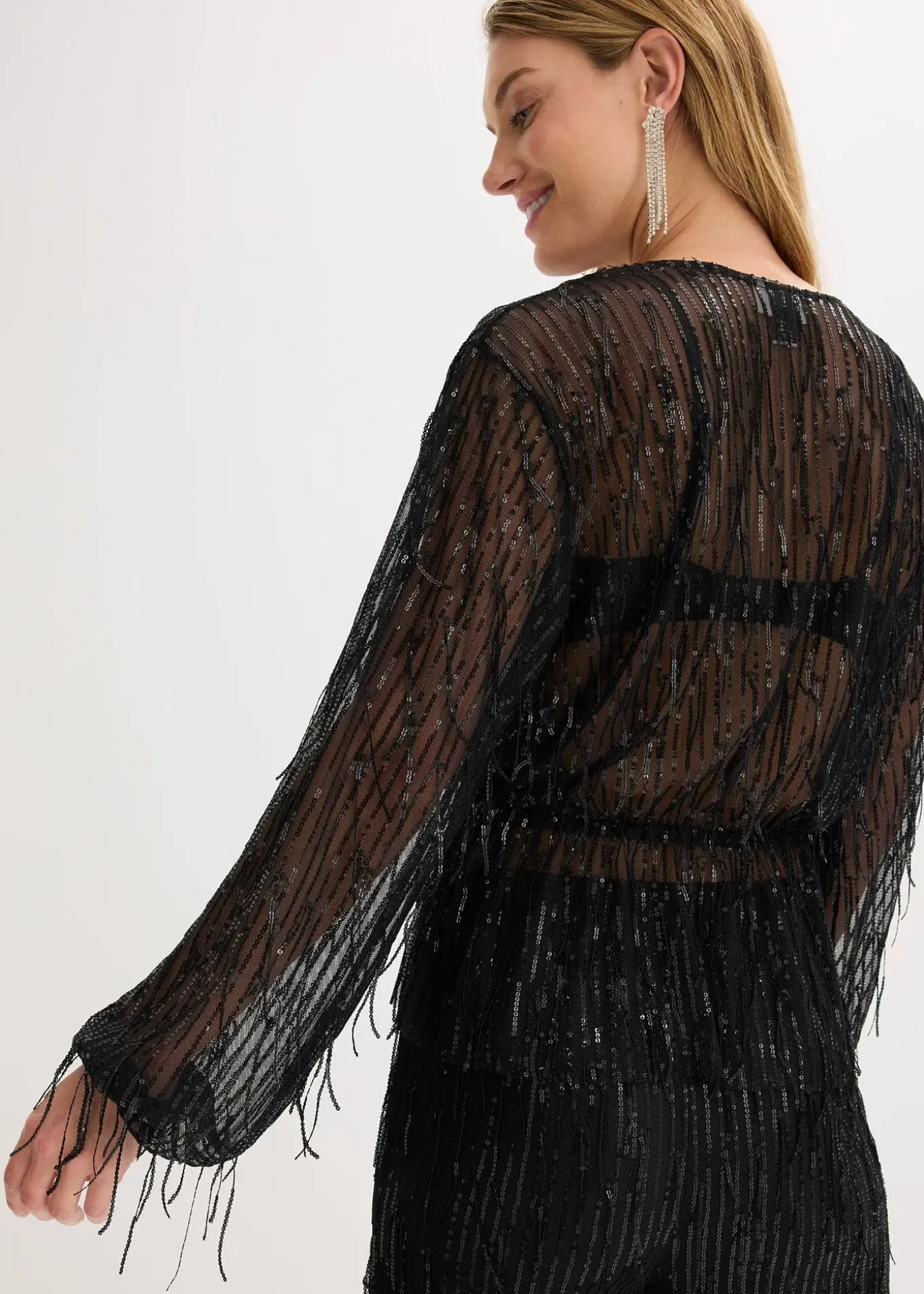 Blouse légèrement extensible et doublée à sequins, franges et décolleté profond