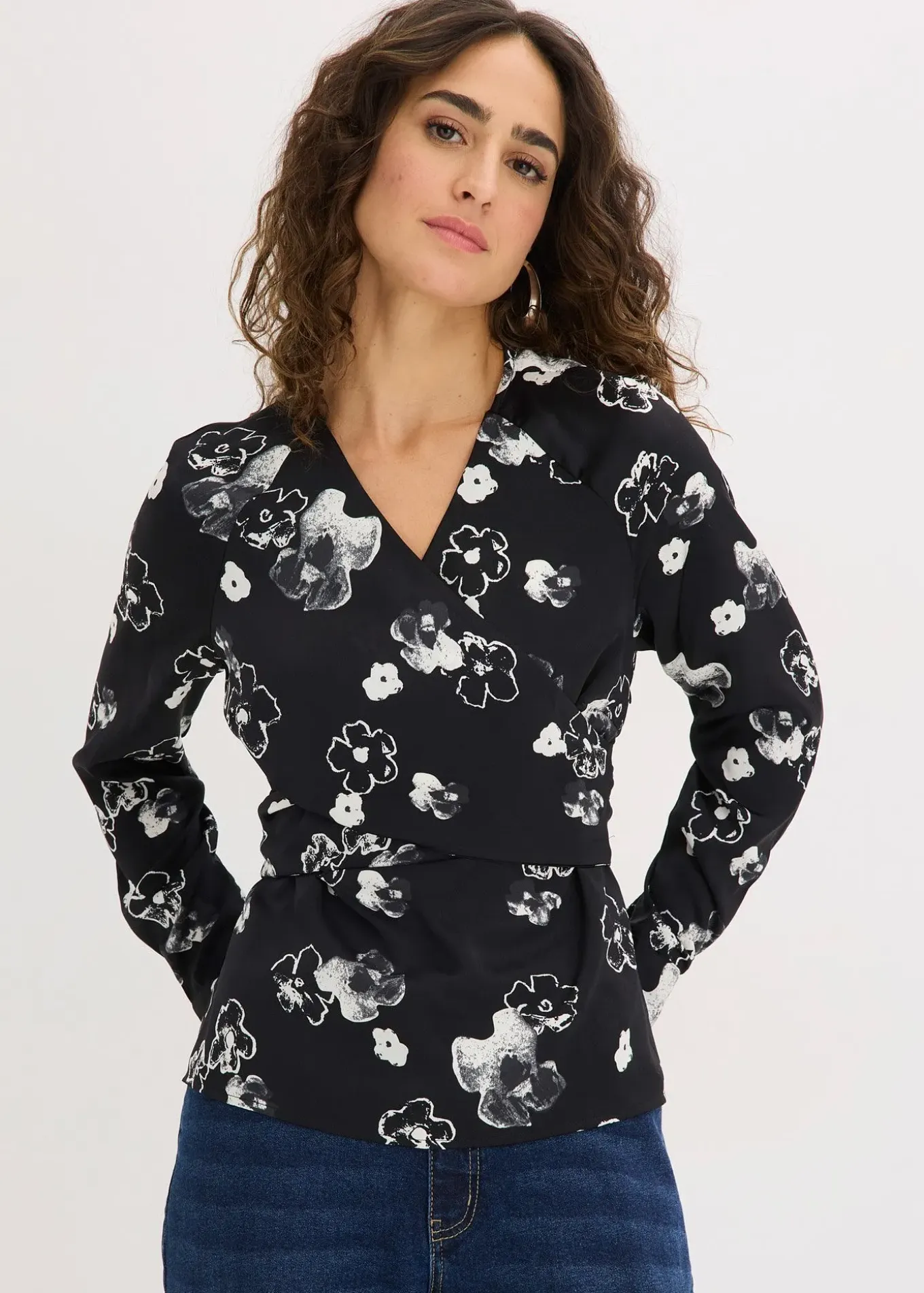 Blouse tendance en satin imprimé, style cache-cœur, à nouer dans le dos