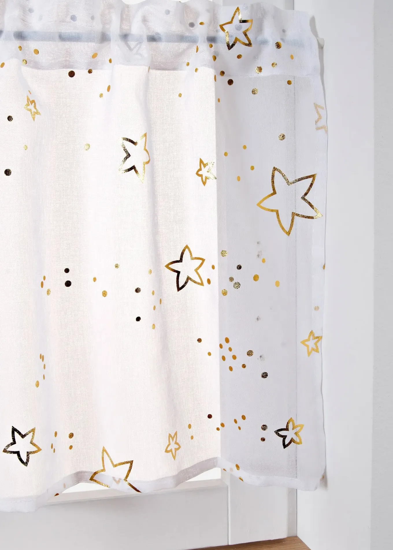 Brise-bise festif et élégant avec un imprimé brillant. Tissu lavable en polyester majoritairement recyclé. Coulisse passe-tringle pour un accrochage facile.
