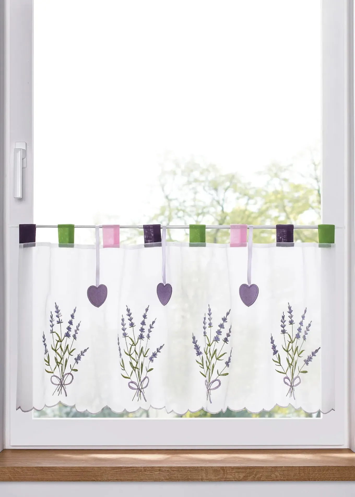Brise-bise avec jolie lavande brodée et petits cœurs colorés suspendus, amovibles si besoin. Un effet déco pour votre fenêtre de cuisine !
