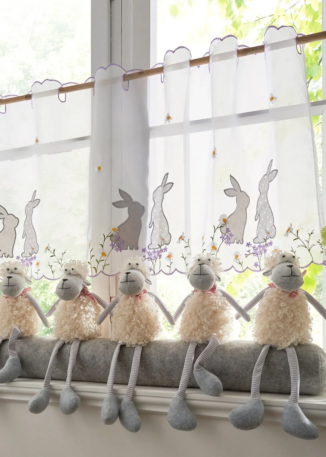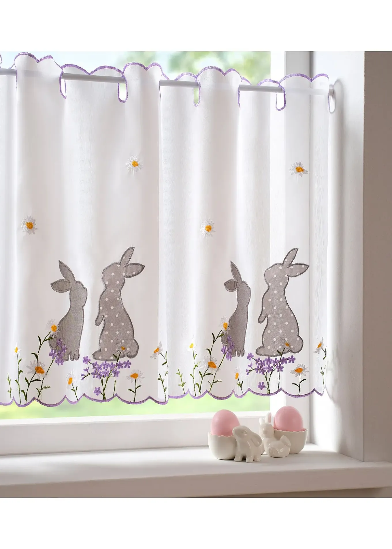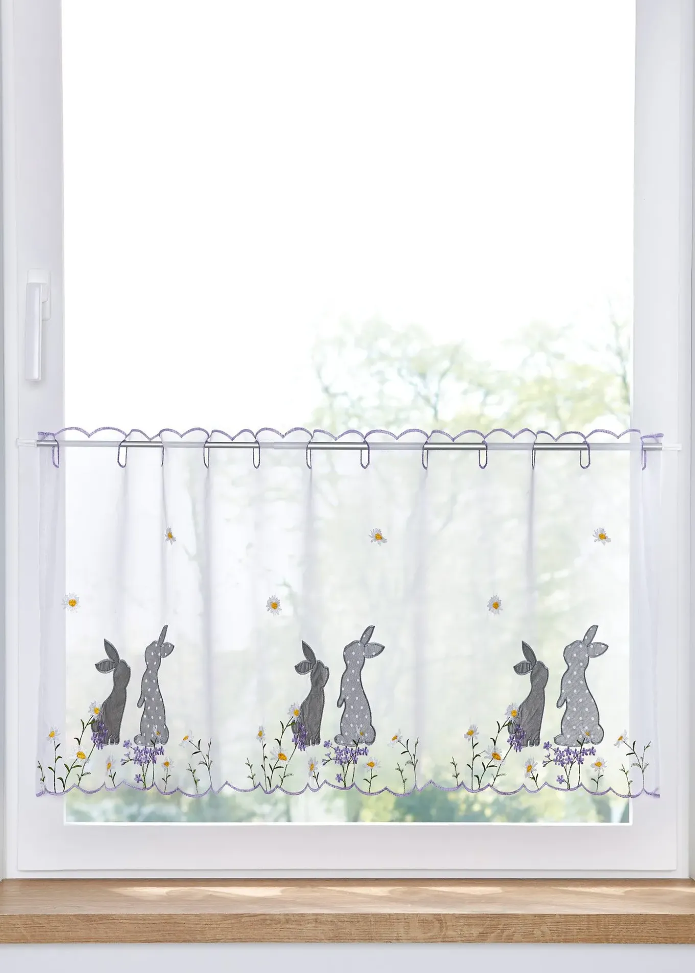 Brise-bise transparent avec adorables lapins brodés et applications. S’installe en quelques gestes pour créer une ambiance de Pâques à votre fenêtre.