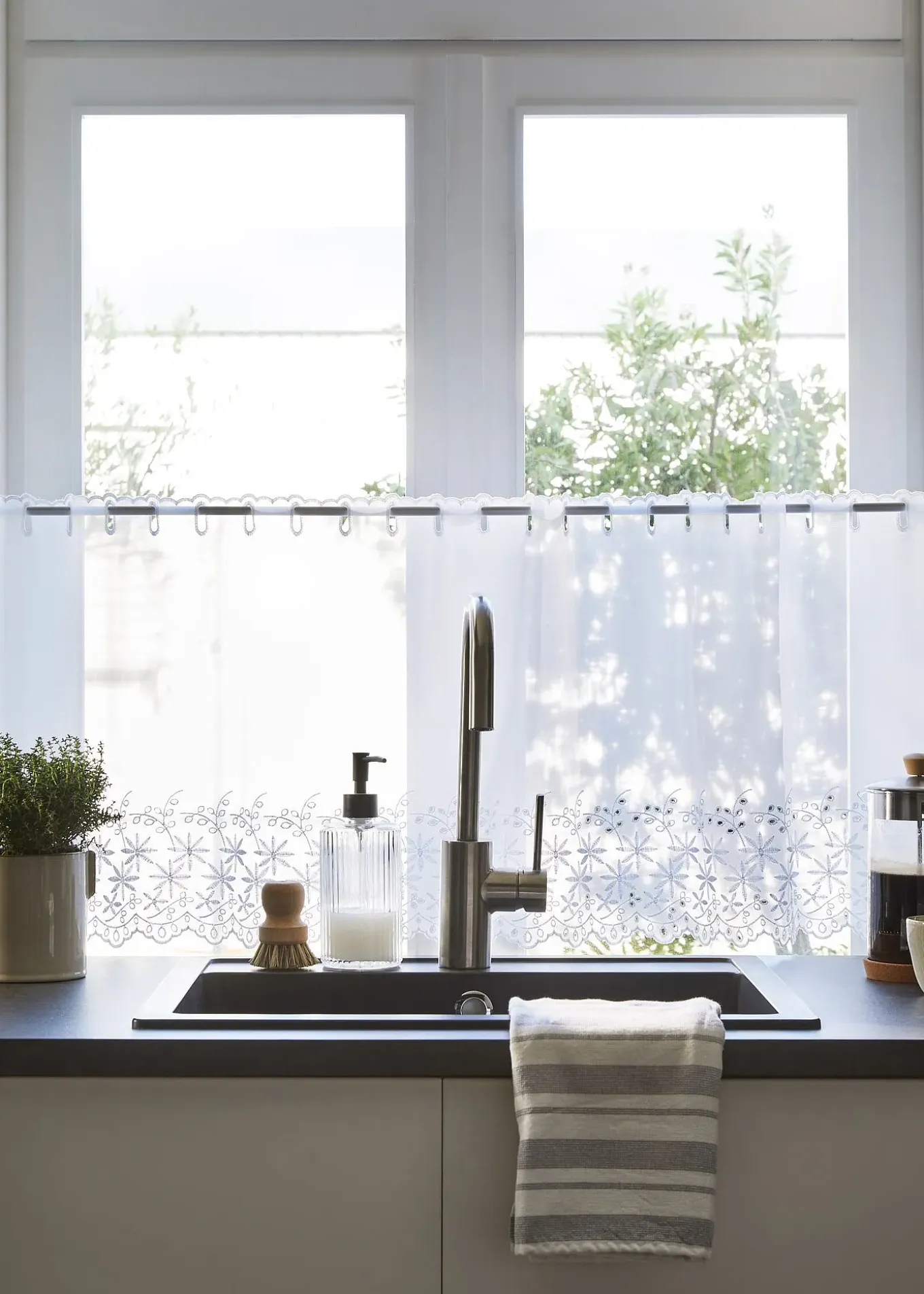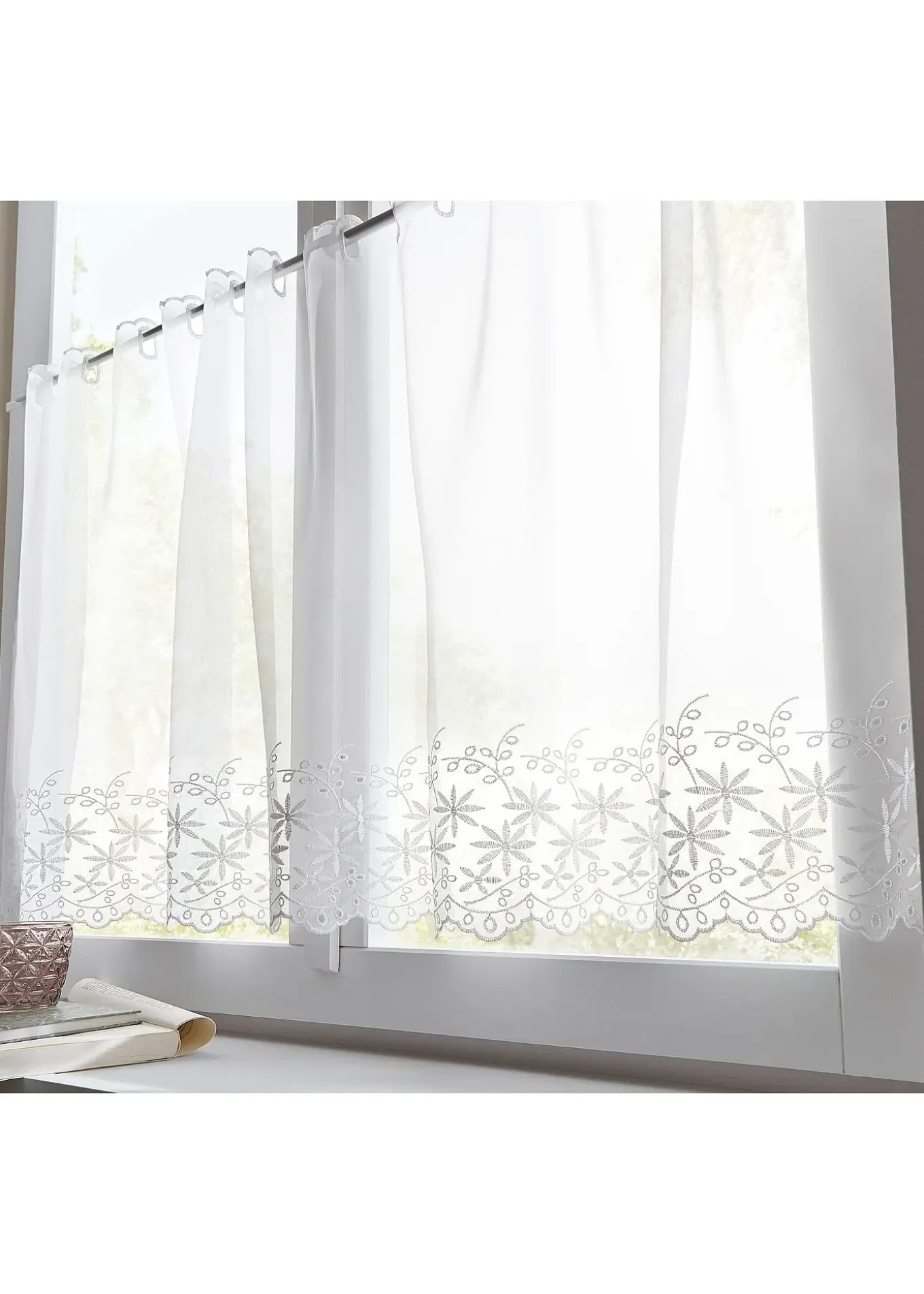 Vitrage en voile transparent avec broderies anglaises et œillets passe-tringle pour diamètre max. 3 cm.