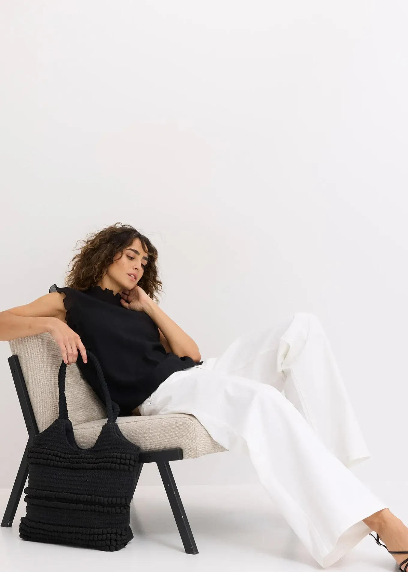 Cabas estival en tissu avec petits détails nœuds. Parfait pour les journées ensoleillées au bord de l’eau. Largeur supérieure env. 35 cm.