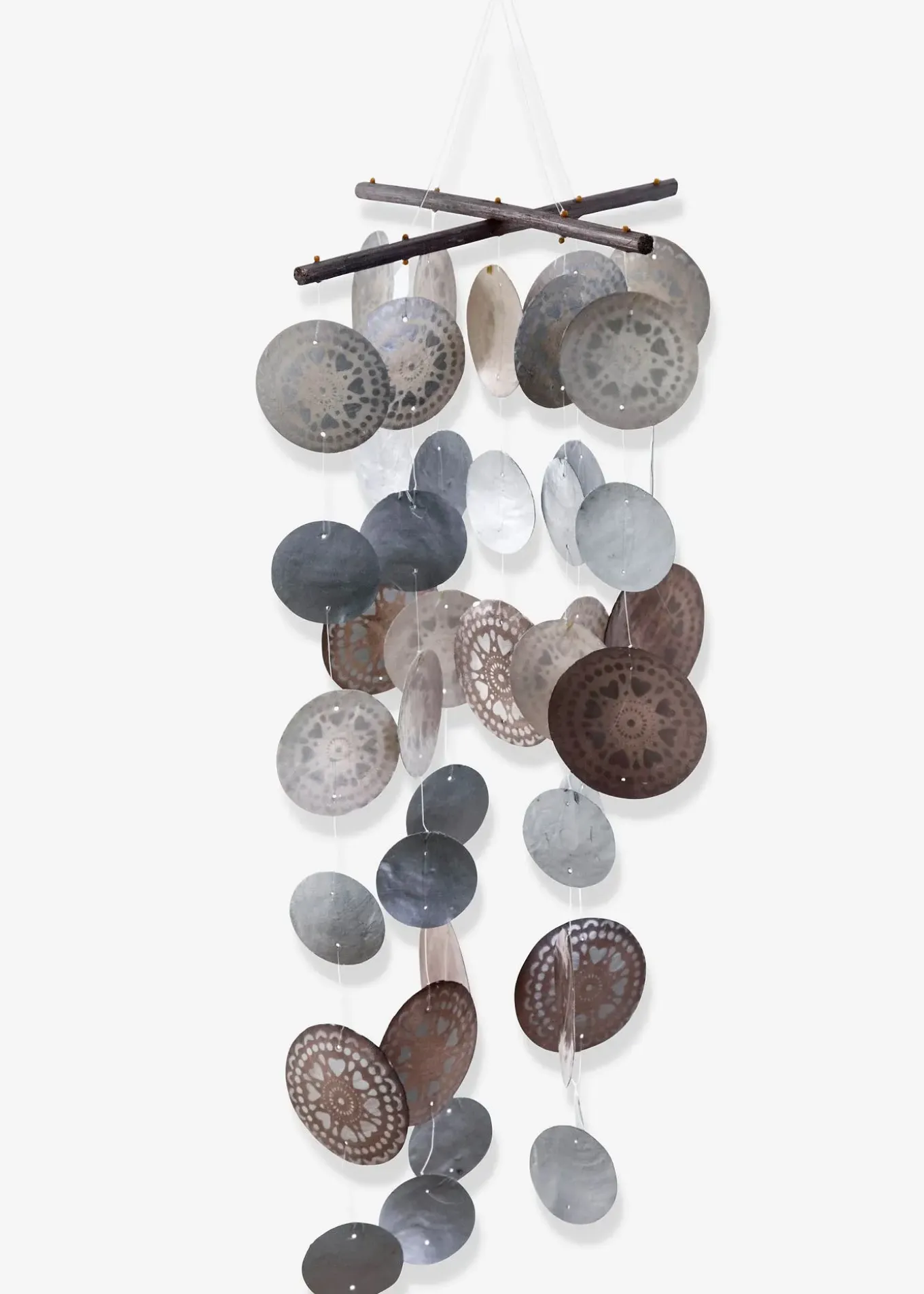 Superbe carillon pour la maison ou la terrasse. Cercles de divers tailles (Ø 5, 6, 7,5 cm) en coquille de nacre de Capiz, ornés de motifs et enfilés sur des fils de nylon résistants. Long. (décorations incluses) env. 75 cm.