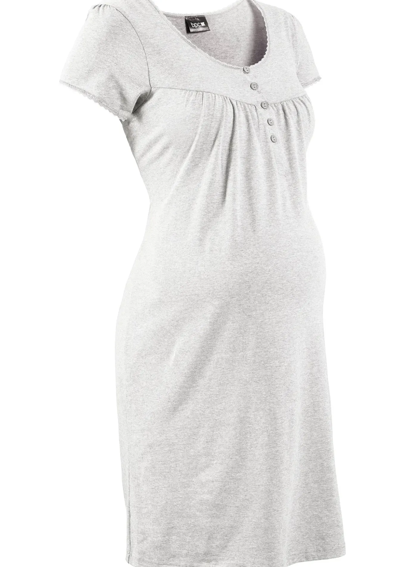 Particulièrement douce et agréable à porter, la chemise de nuit de grossesse Nice Size épouse les formes du corps de la future maman. Féminine, elle est agrémentée d’un petit liseré de dentelle placé à l’encolure et aux manches. Son col rond est doté d’une patte de boutonnage permettant de le transformer en col V. Permettant de bouger librement, sa coupe ample est idéale pour passer une bonne nuit sous la couette.À manches courtes, la chemise de nuit de grossesse peut se compléter d’un gilet léger et de chaussons.