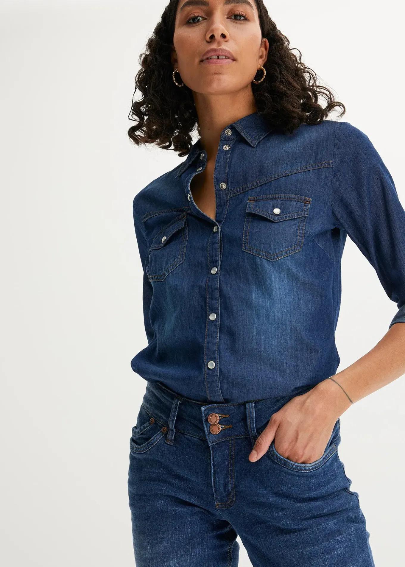 Chemise en jean de la marque John Baner avec boutons-pression contrastés et poches poitrine plaquées. Longueur des manches ajustable à l’aide d’un bouton et d’une patte.