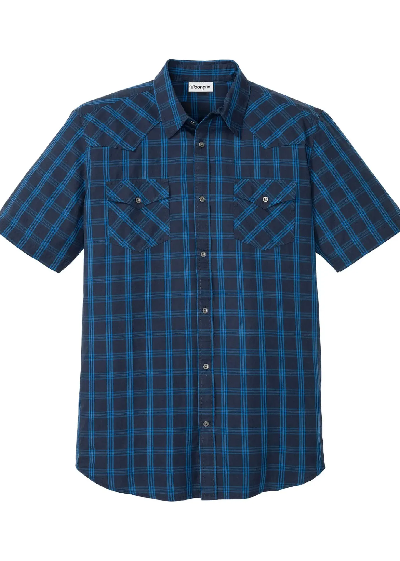 Chemise manches courtes classique, coupe regular, motif carreaux tendance, avec poches poitrine et boutons en métal