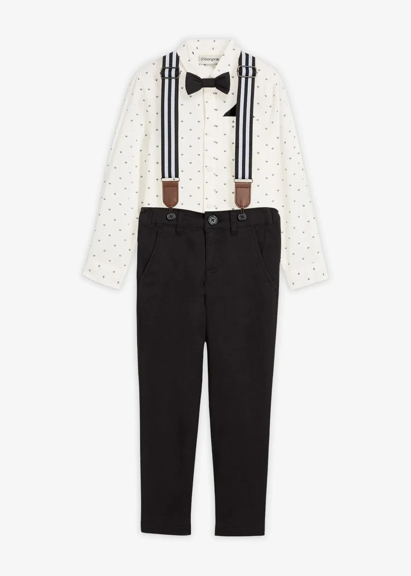Bel ensemble garçon comprenant une chemise, un pantalon chino avec bretelles réglables et un nœud papillon