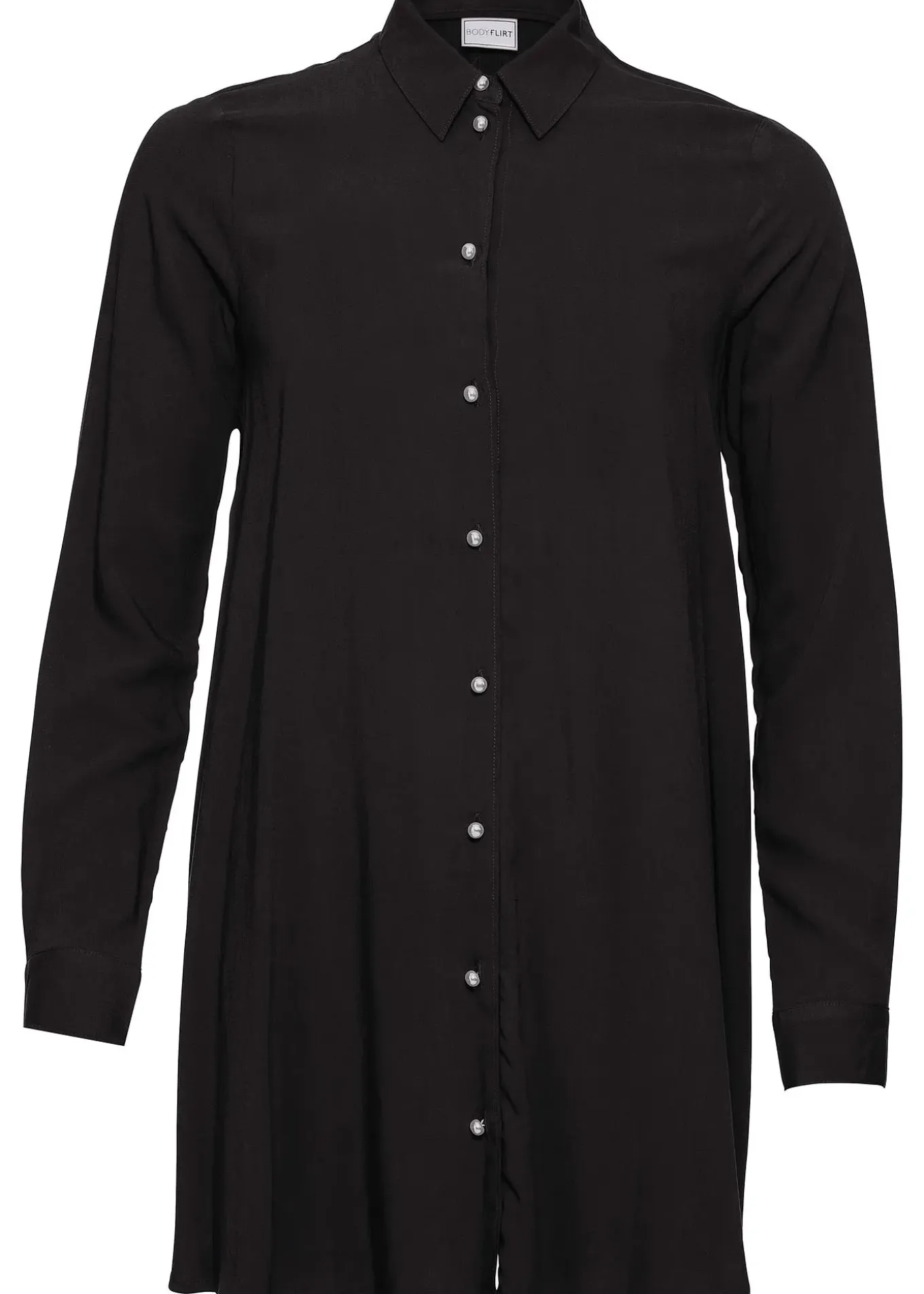 Chemisier long élégant à décolleté en V, coupe trapèze, avec patte de boutonnage à boutons perles. Long. env. 80 cm.