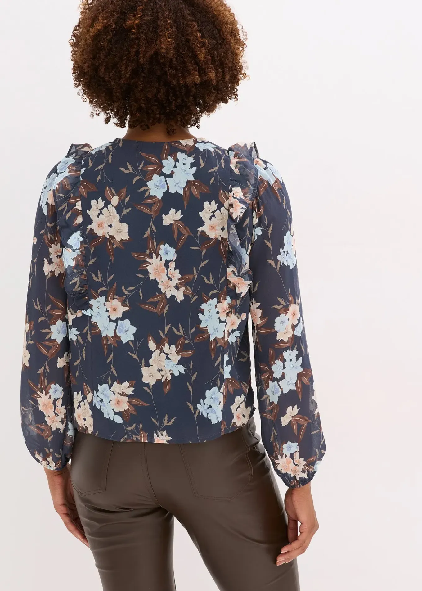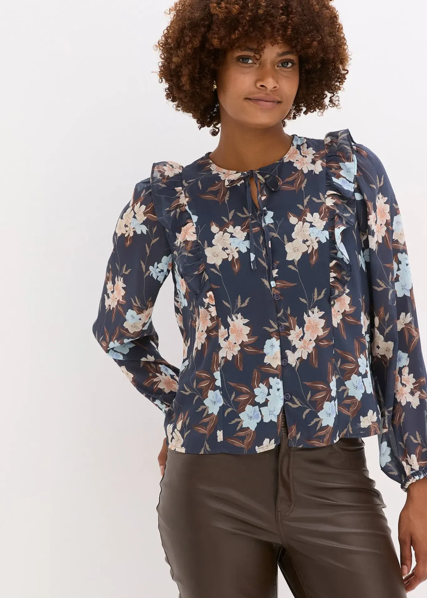Blouse décontractée en mousseline avec lien à nouer, boutons et volants