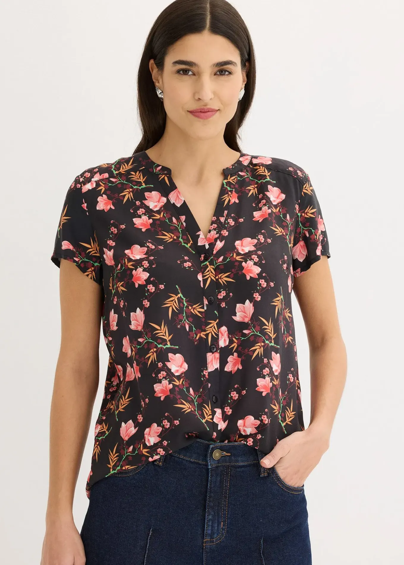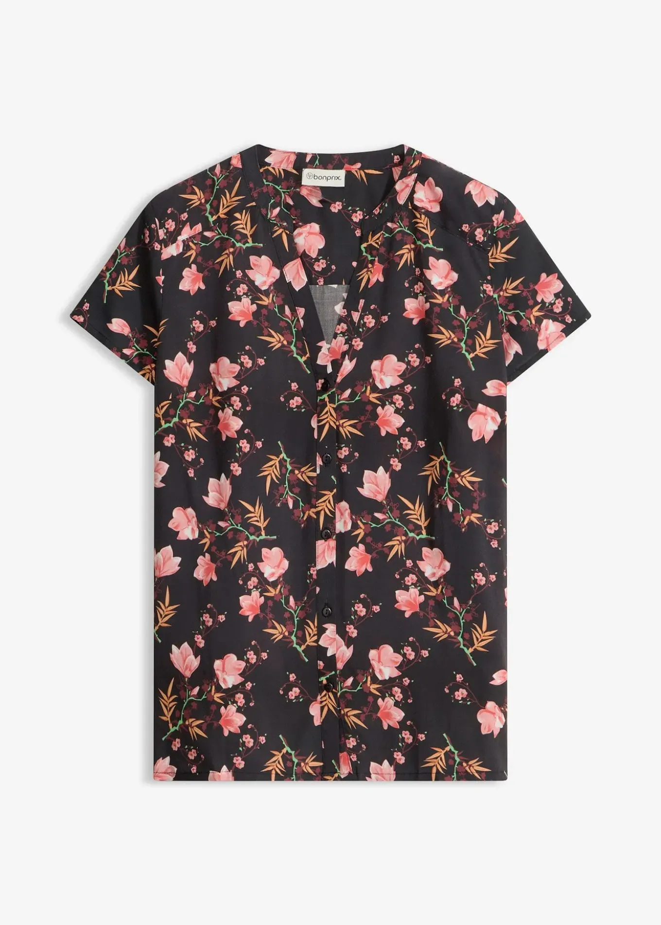 Chemisier mode de BODYFLIRT. Chemisier à manches courtes entièrement boutonné sur le devant avec un décolleté en V. Long. env. 62 cm.