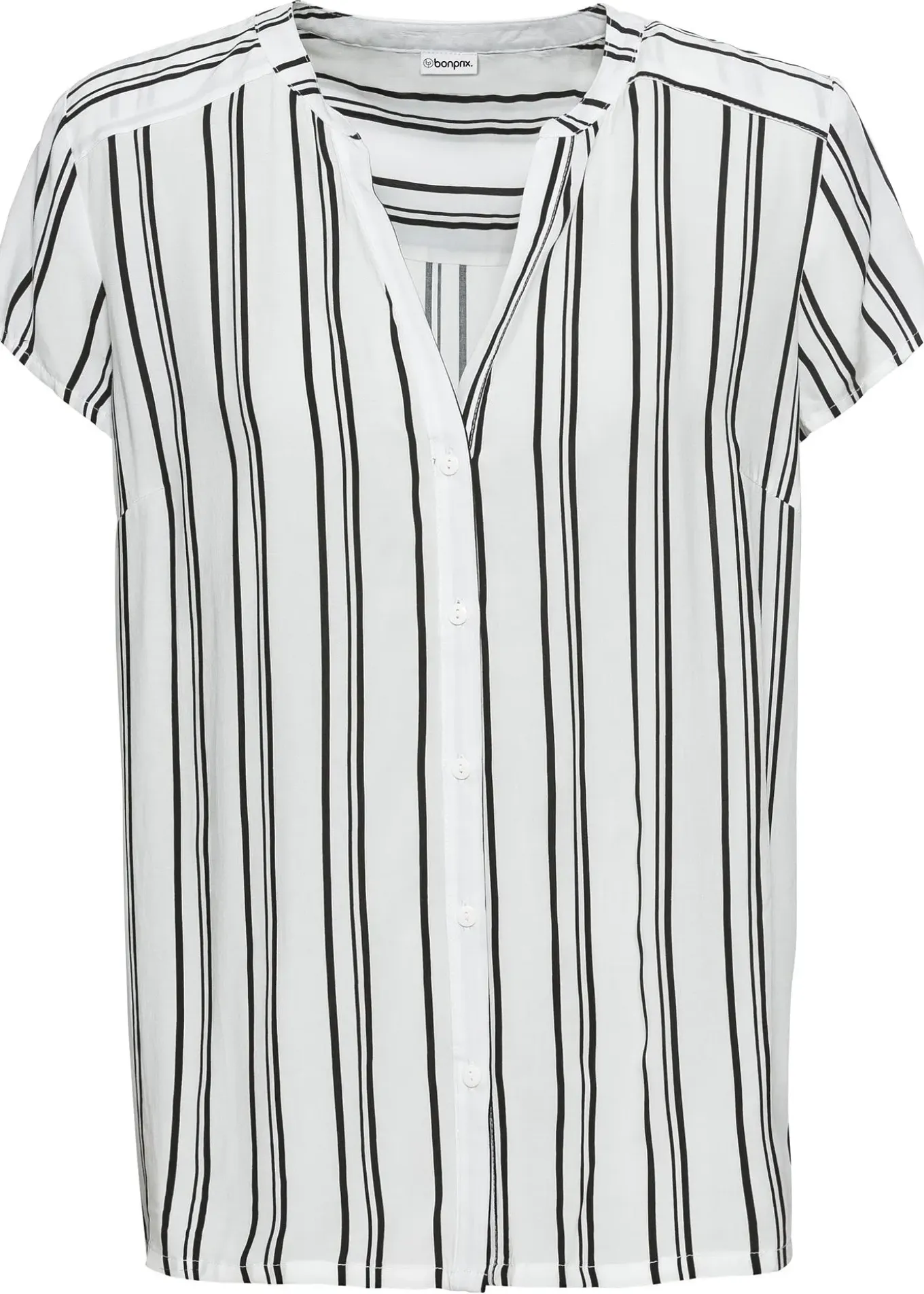 Chemisier mode de BODYFLIRT. Chemisier à manches courtes entièrement boutonné sur le devant avec un décolleté en V. Long. env. 62 cm.