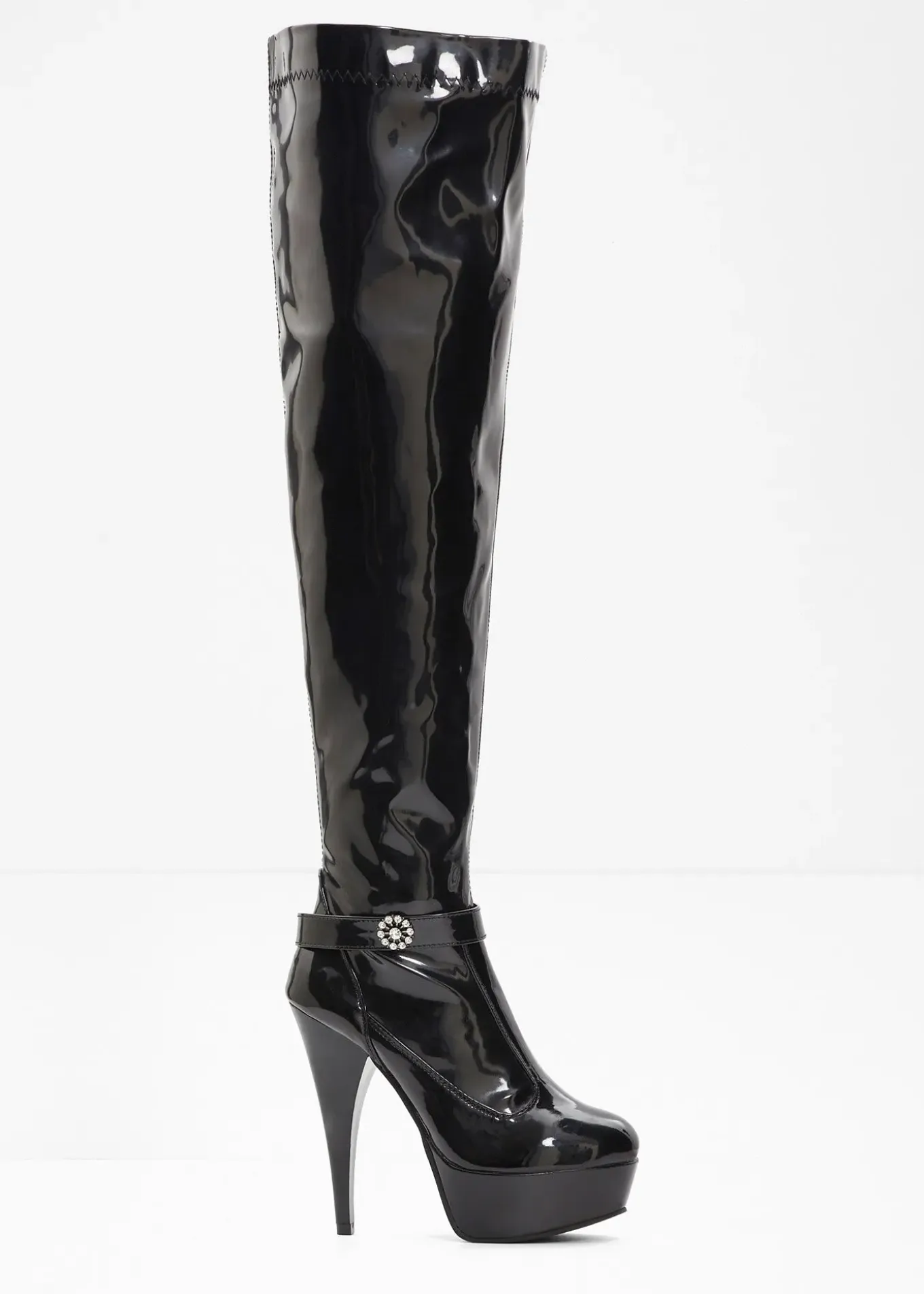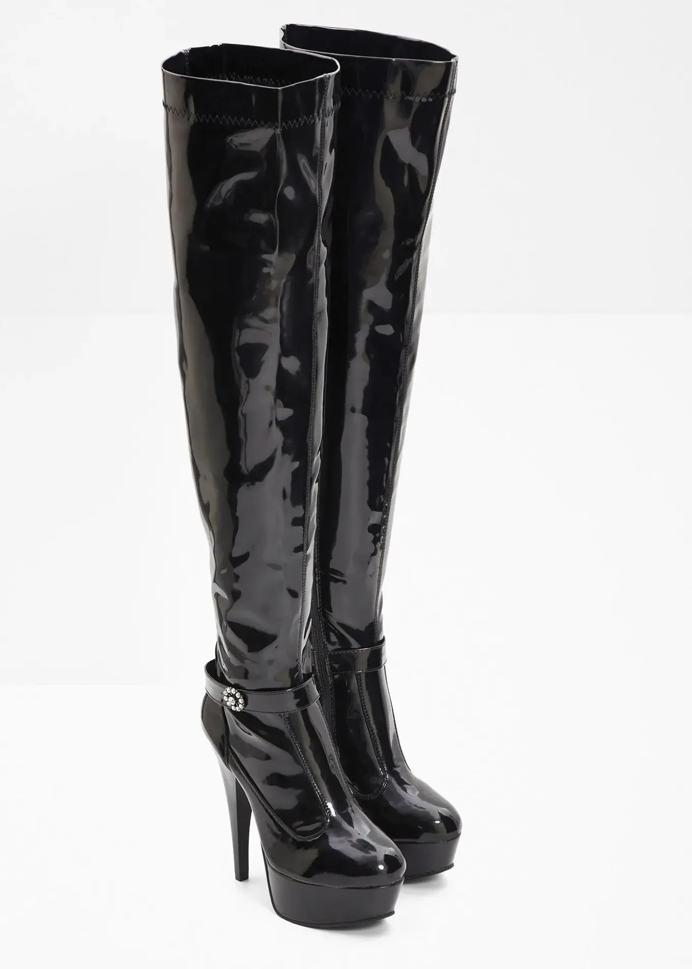 Cuissardes vernies à plateau excentriques qui nous séduisent par leur look ravissant et tape-à-l’œil.