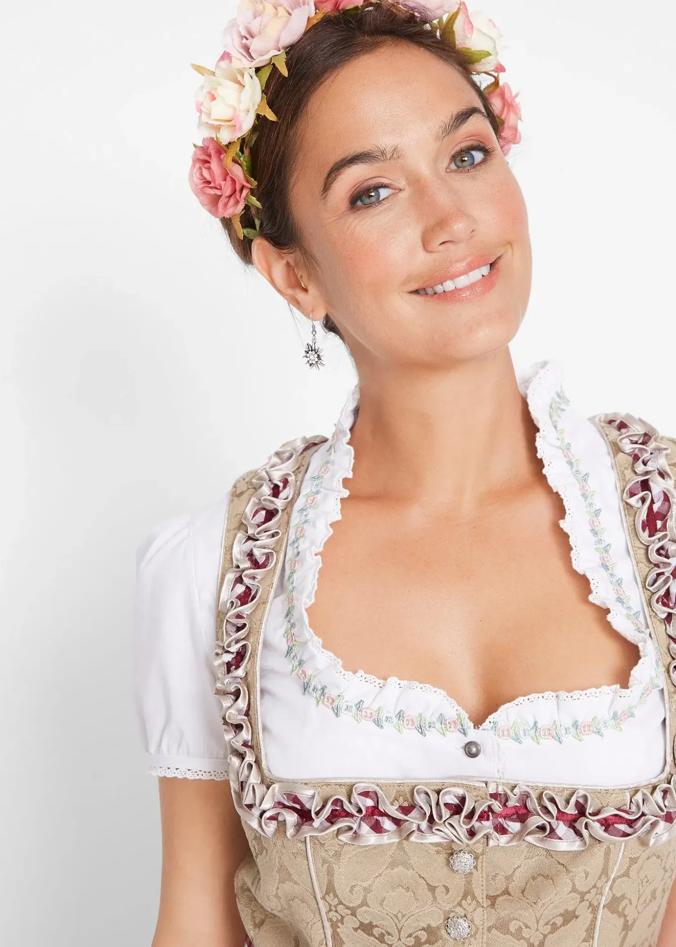 Dirndl longueur genou à tablier de bpc, motif brillant, dentelle contrastante. Encolure carrée bordée d’un galon plissé. Boutons décoratifs. Tablier à carreaux et jupe à poches latérales dissimulées dans la couture.