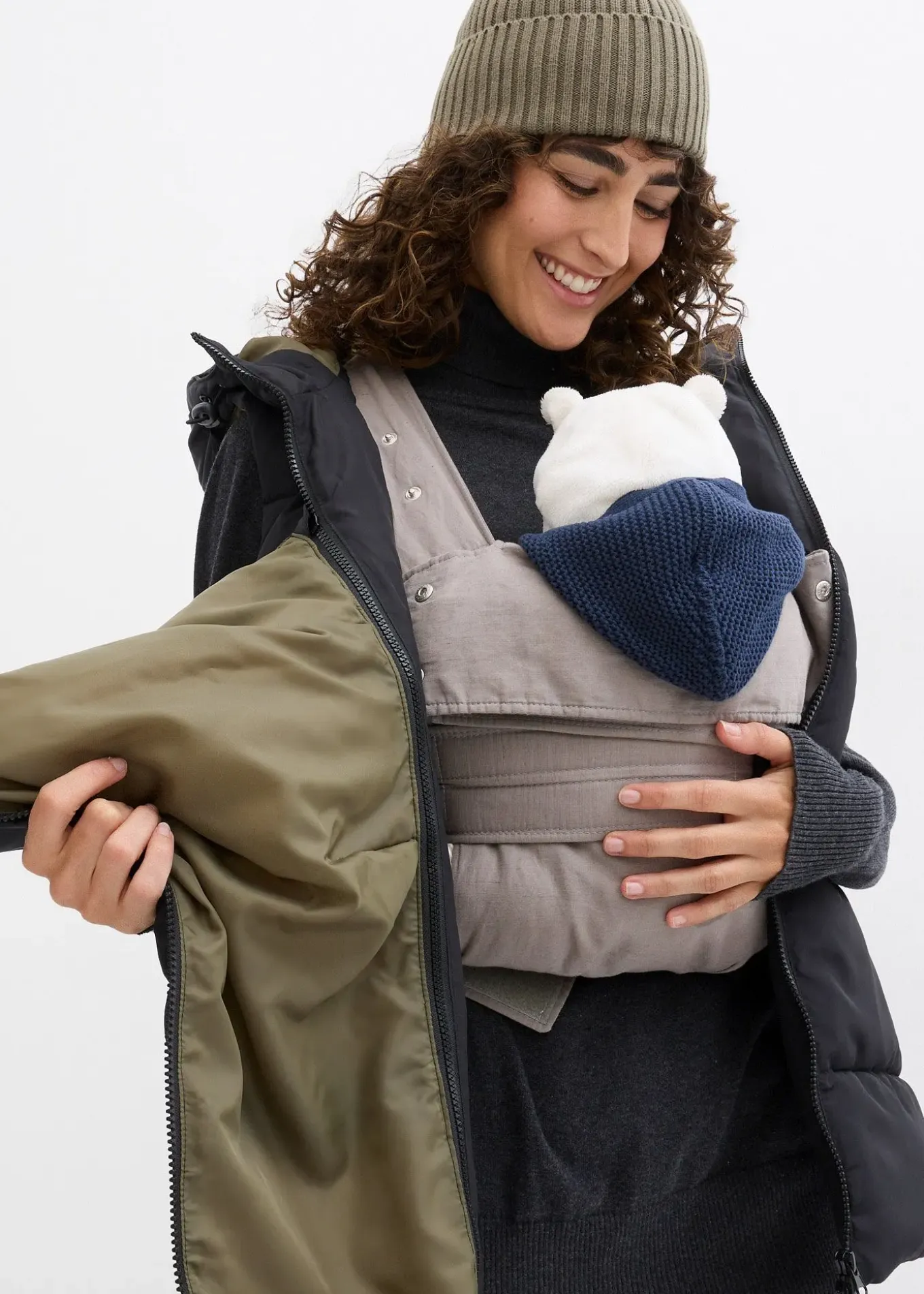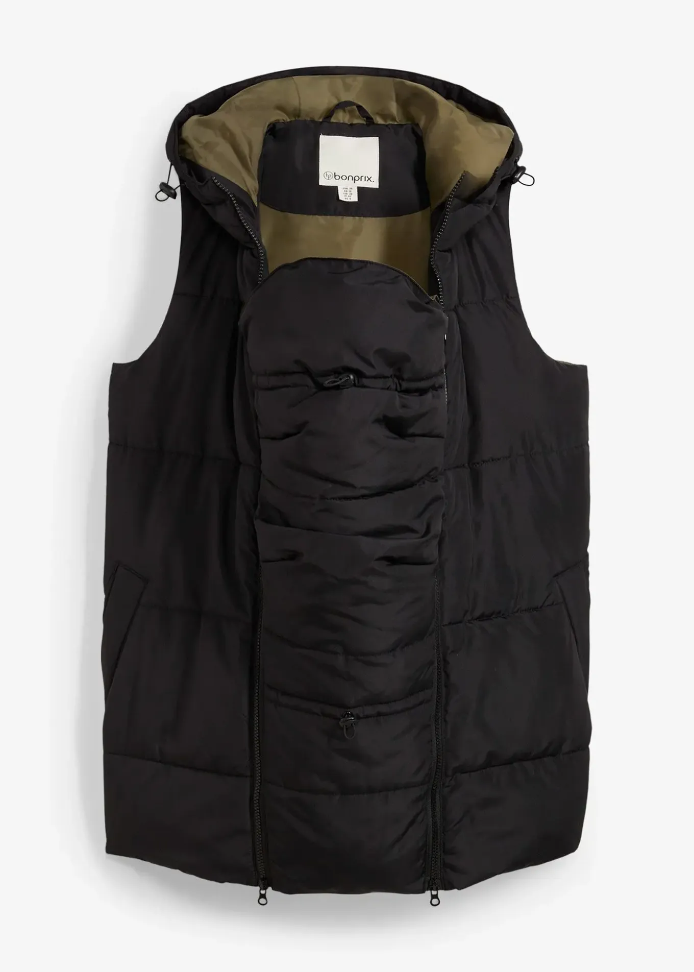 Doudoune de grossesse sans manches en matière déperlante, avec un empiècement de portage pratique. Fermetures zippées sur le côté pour régler la largeur. Poches sur le devant et capuche réglable par cordon de serrage.