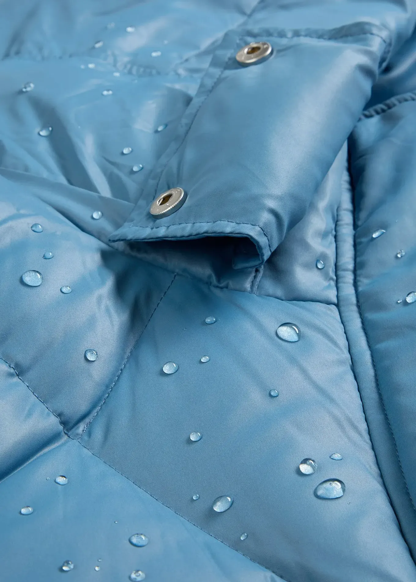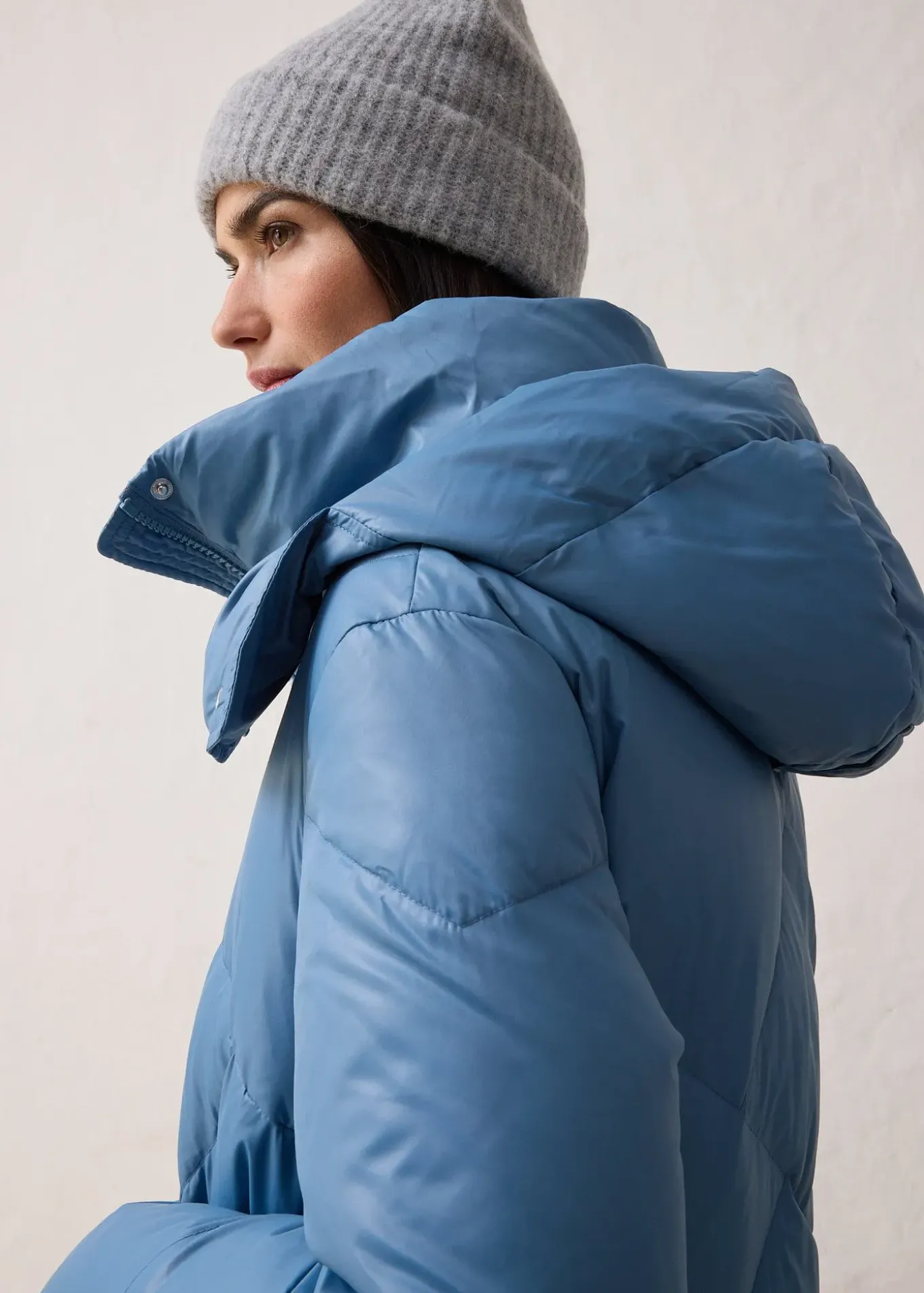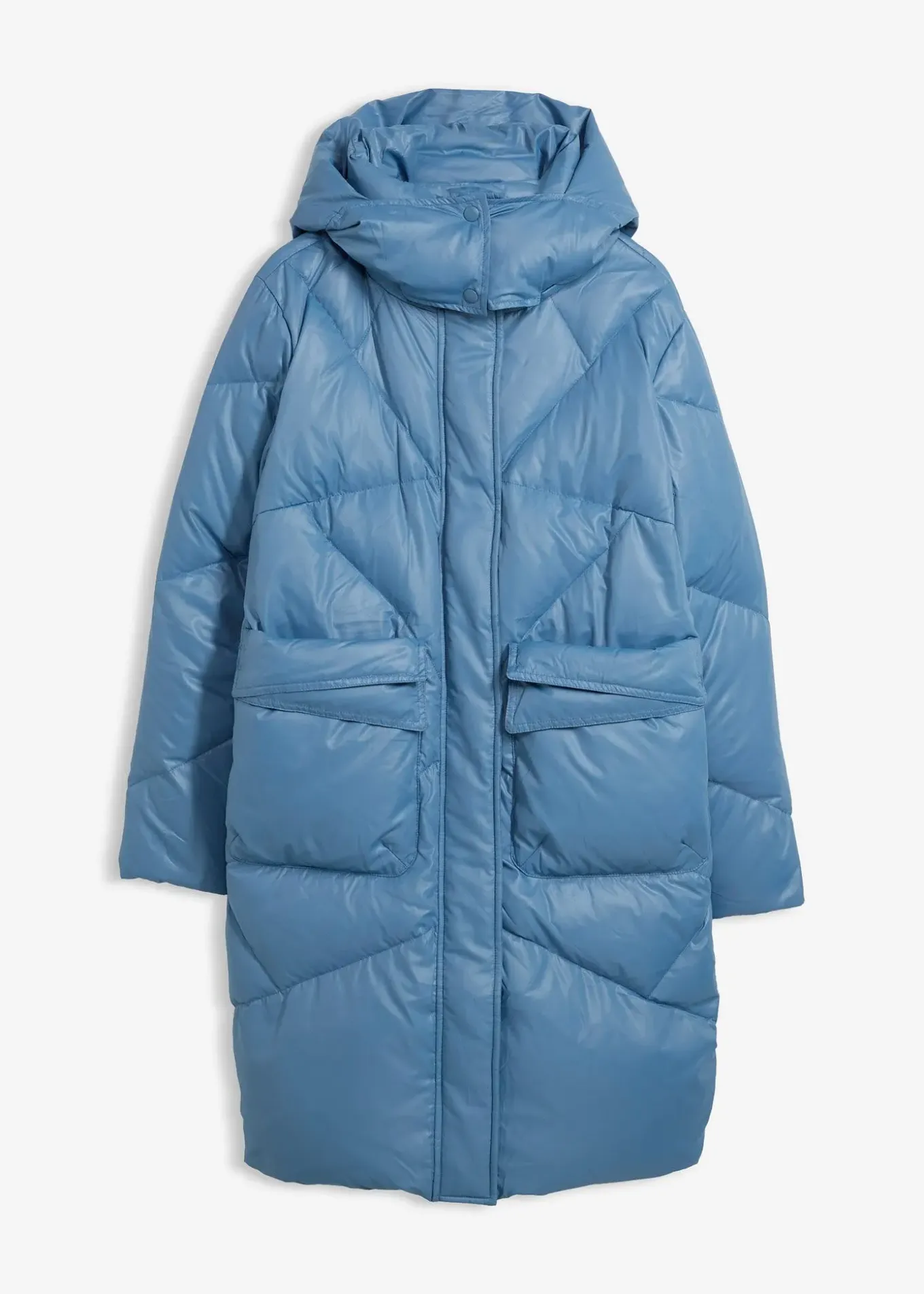 Doudoune longue de qualité supérieure : rembourrage en duvet, matelassage moderne, finition déperlante et capuche amovible