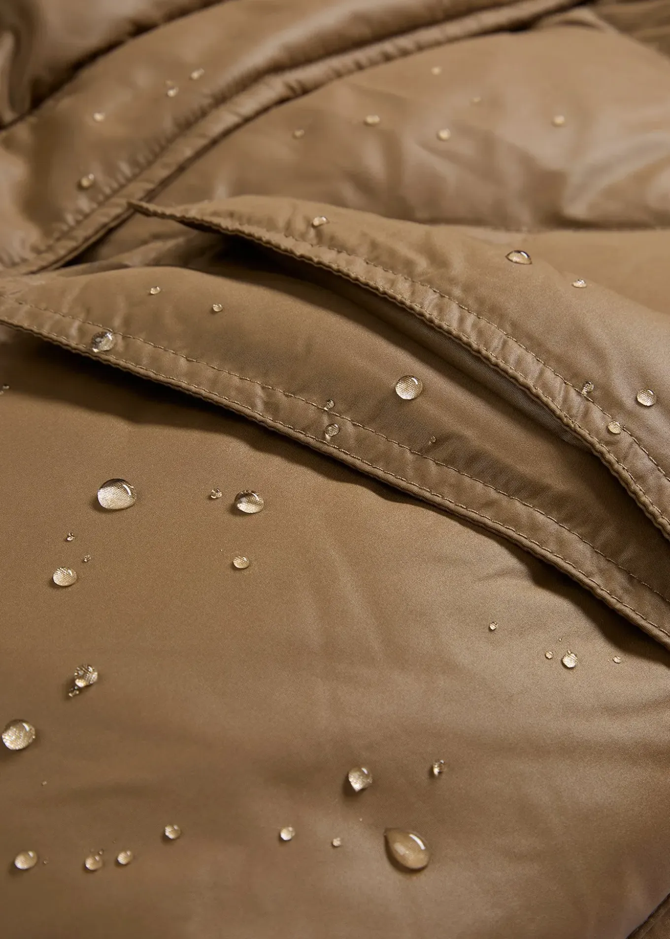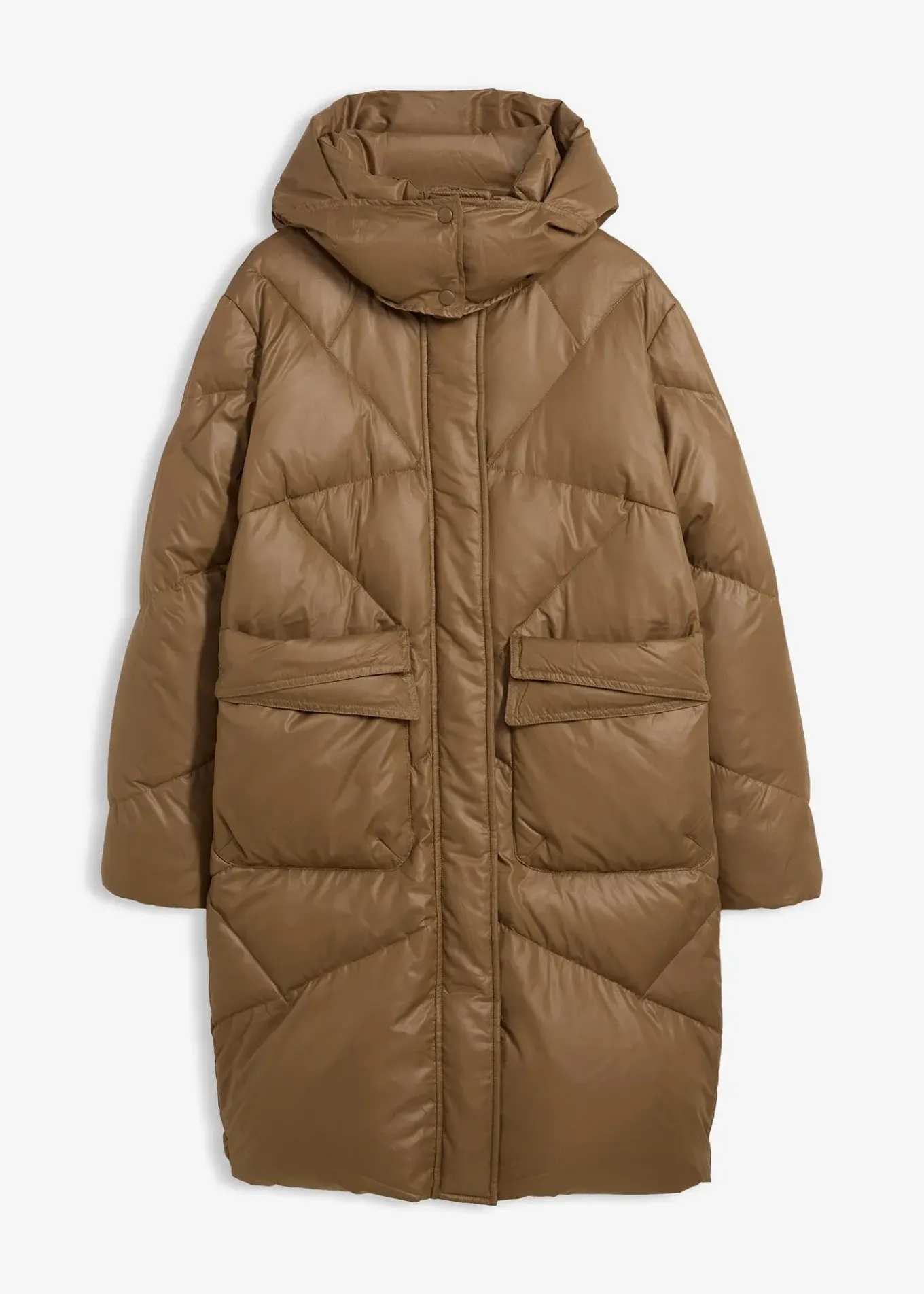 Doudoune longue de qualité supérieure : rembourrage en duvet, matelassage moderne, finition déperlante et capuche amovible
