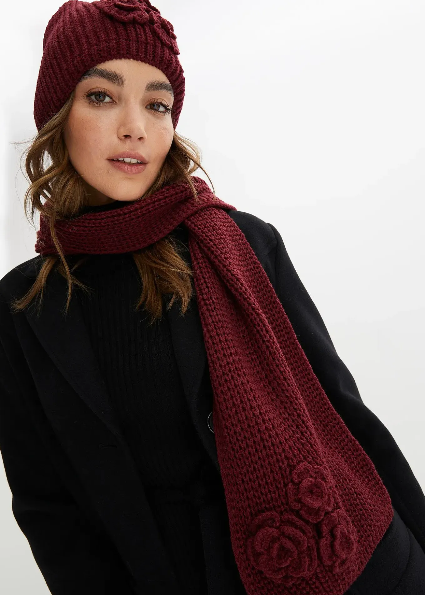 Ensemble en maille chaude comprenant un bonnet et une écharpe. Bonnet hauteur env. 21 cm et largeur env. 23 cm.