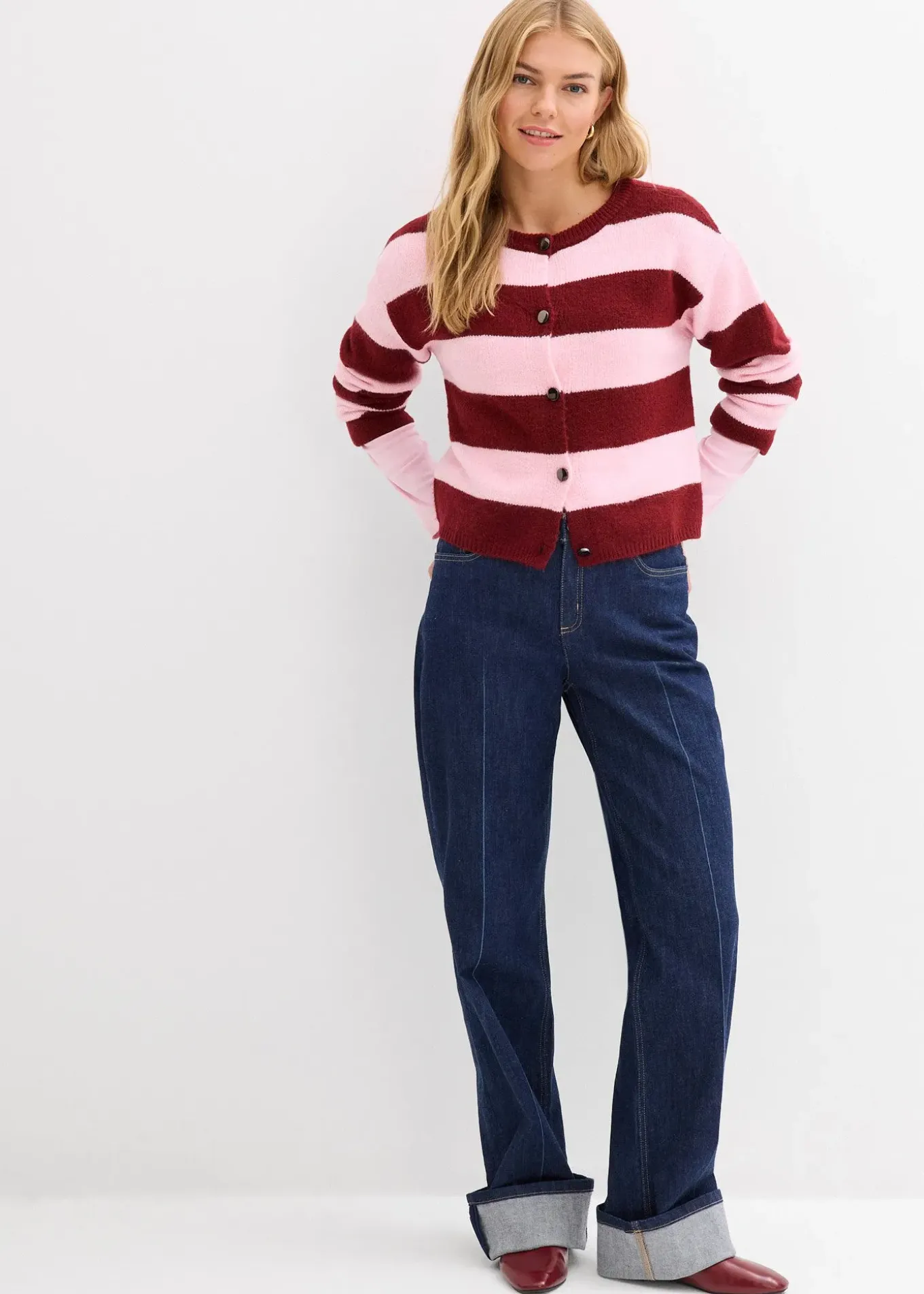 Gilet court et boutonné en fine maille rayée
