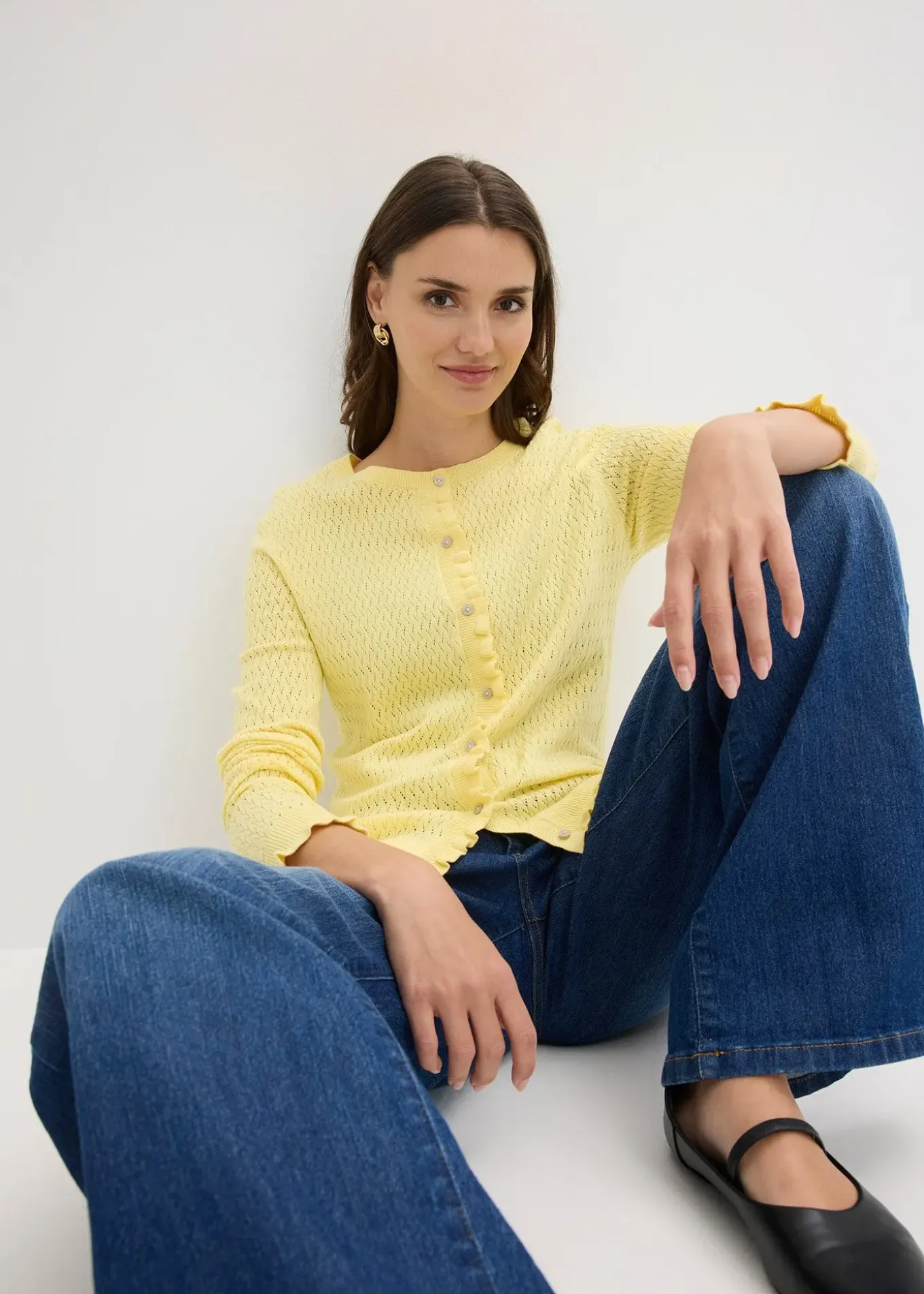 Gilet en maille moderne avec des petits volants à la base, aux poignets et le long de la patte de boutonnage