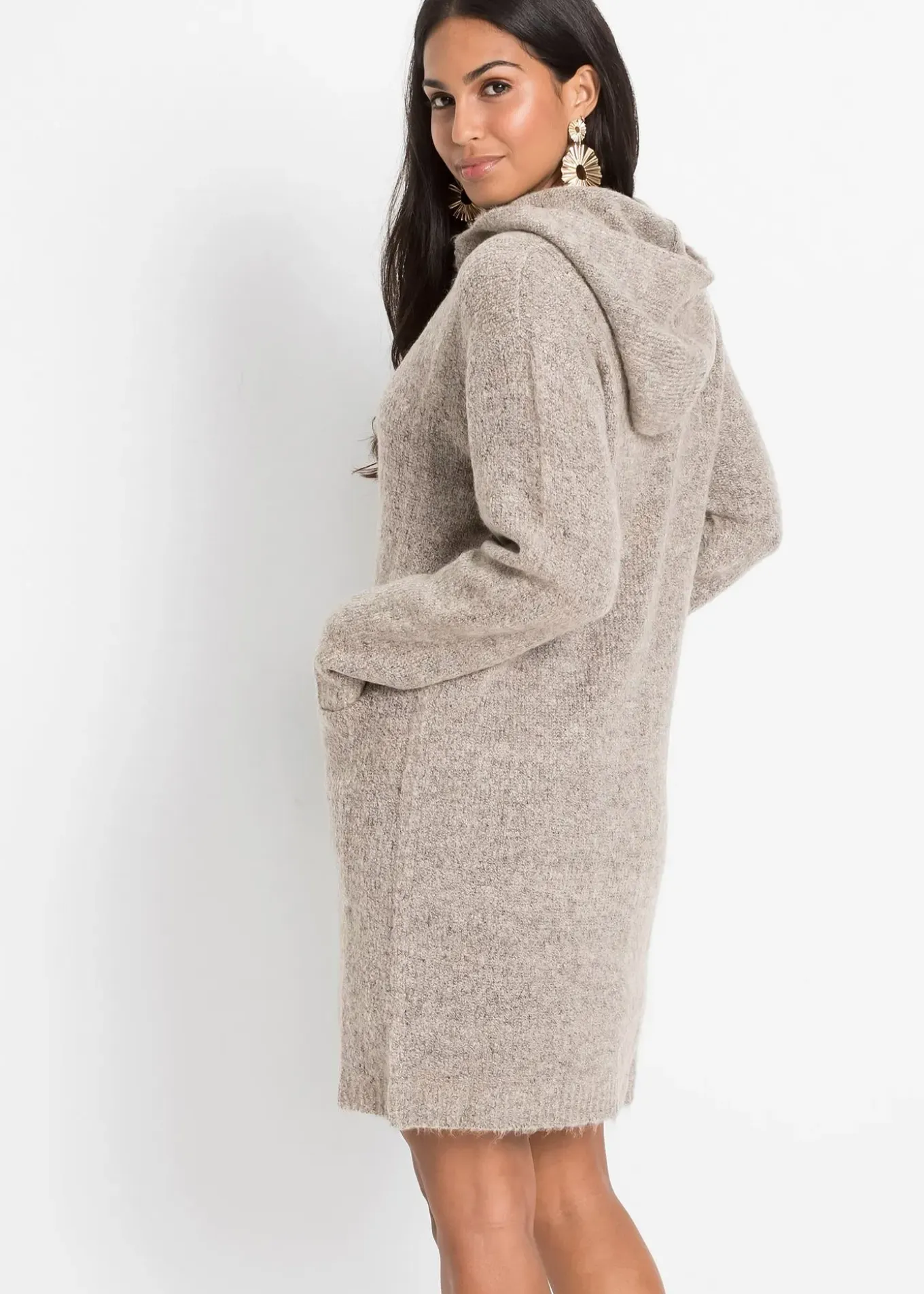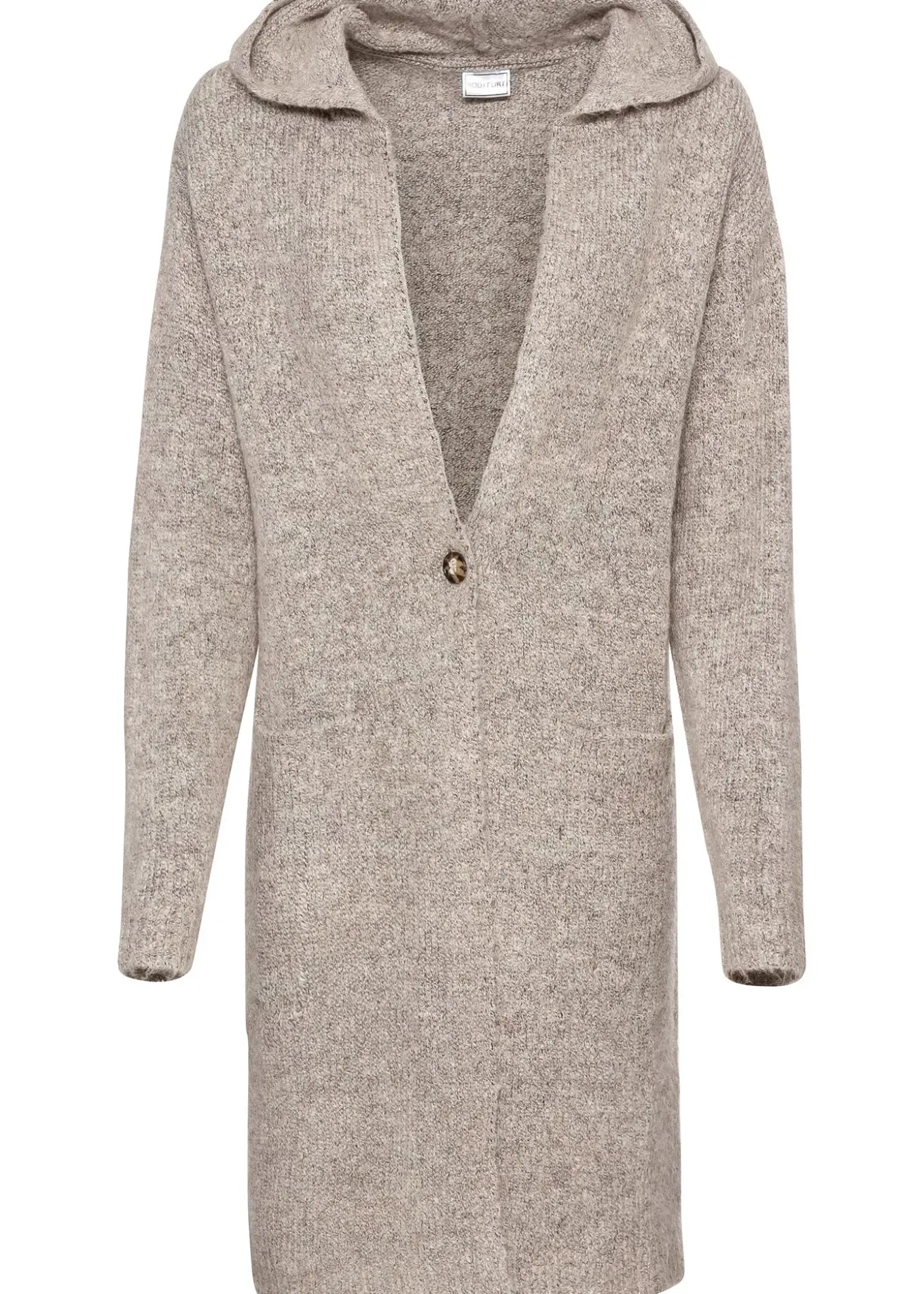 Gilet long douillet en maille à capuche avec fermeture boutonnée. Long. env. 90 cm.