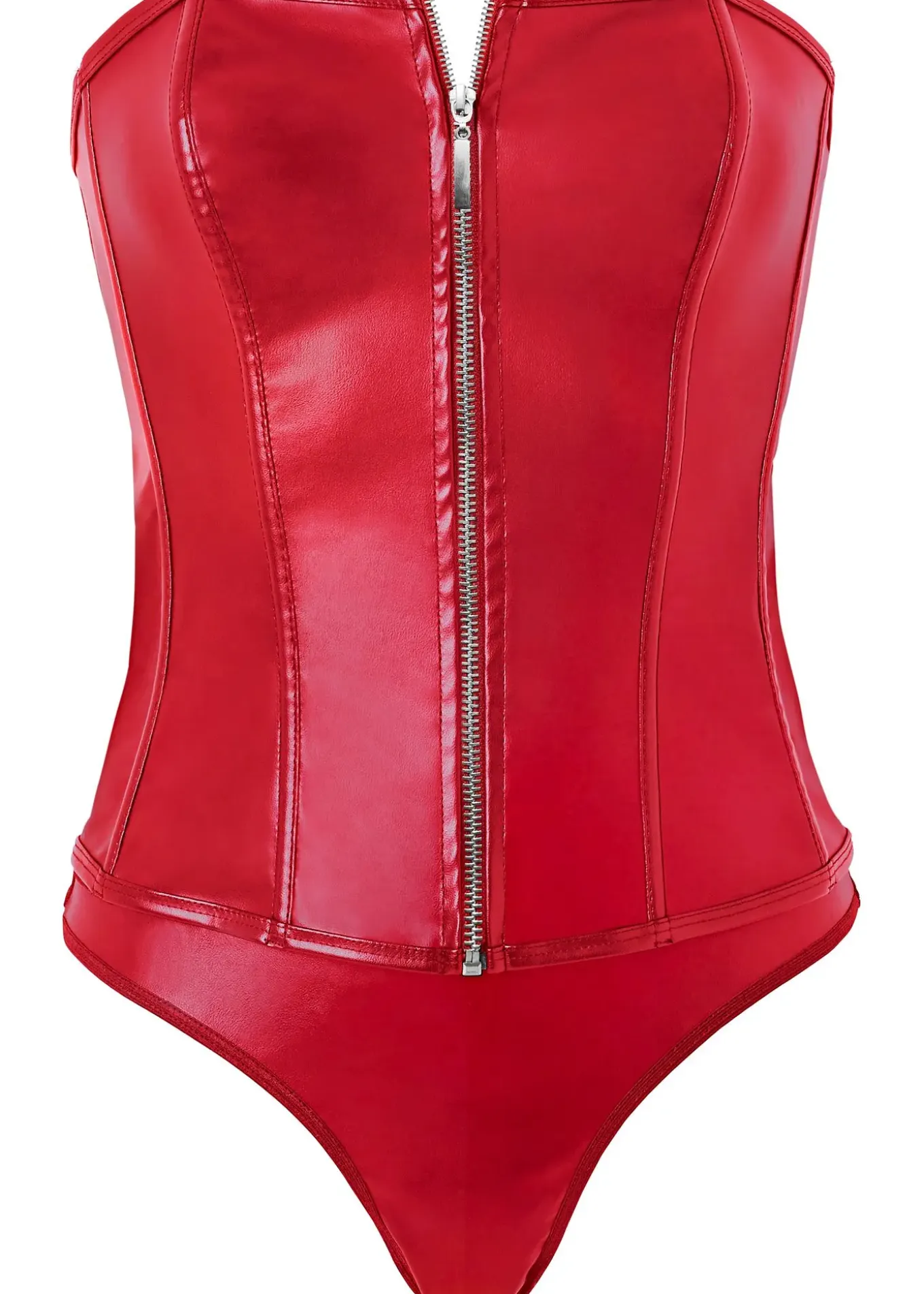 Guêpière ajustée pour un look ultra sexy. Une véritable invitation avec son zip sur le devant. Matière enduite très agréable à porter. Dos ajustable par un laçage.