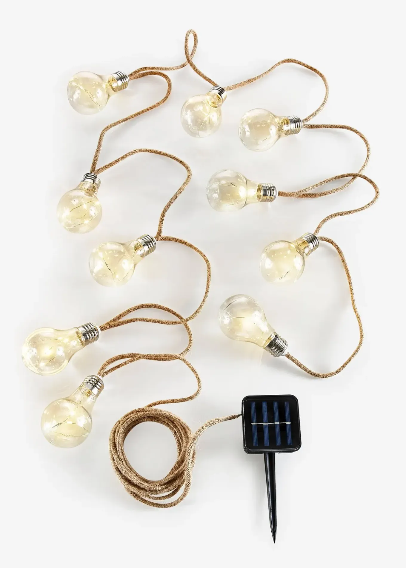 Avec 1 LED à lumière blanche chaude, avec capteur crépusculaire dès que la luminosité décline, durée d’éclairage env. 8h. Fonctionne avec batterie 1 x AA 1,2V, 300mAh NI-MH (incluse). 10 boules avec chacune 1 fil métallique avec 5 LED, éclairage à lumière blanche chaude. Distance entre les boules 30 cm.