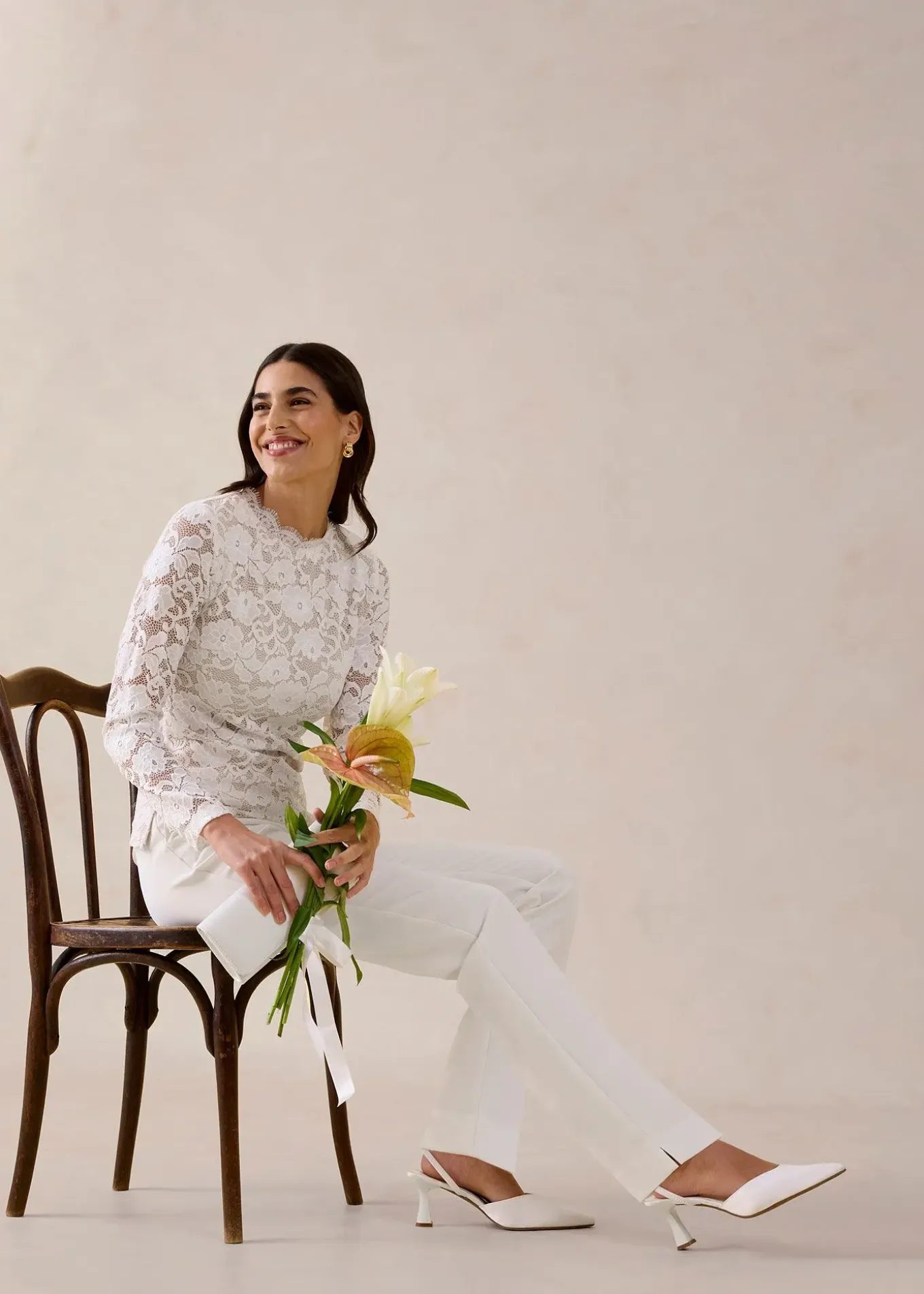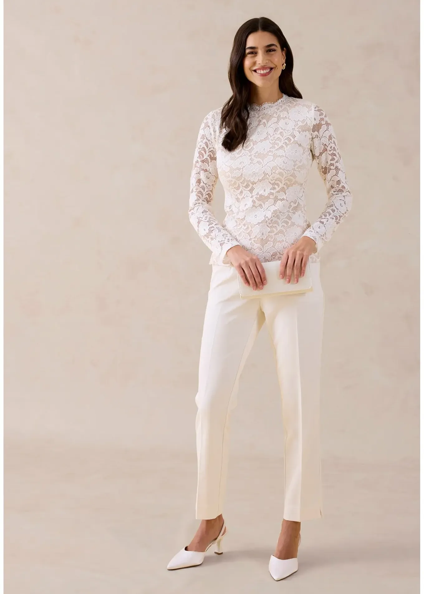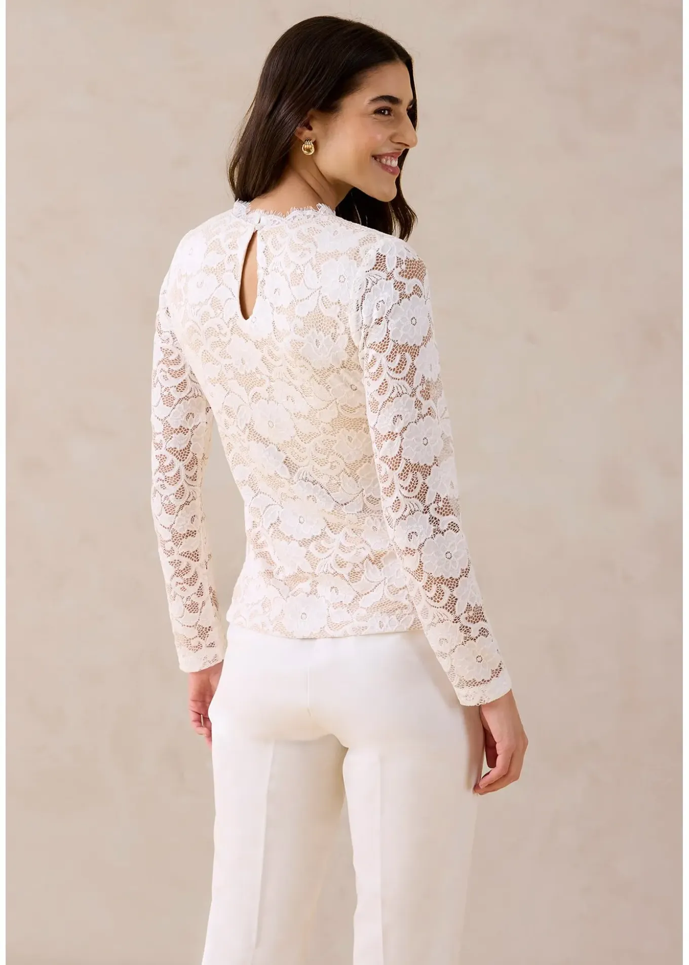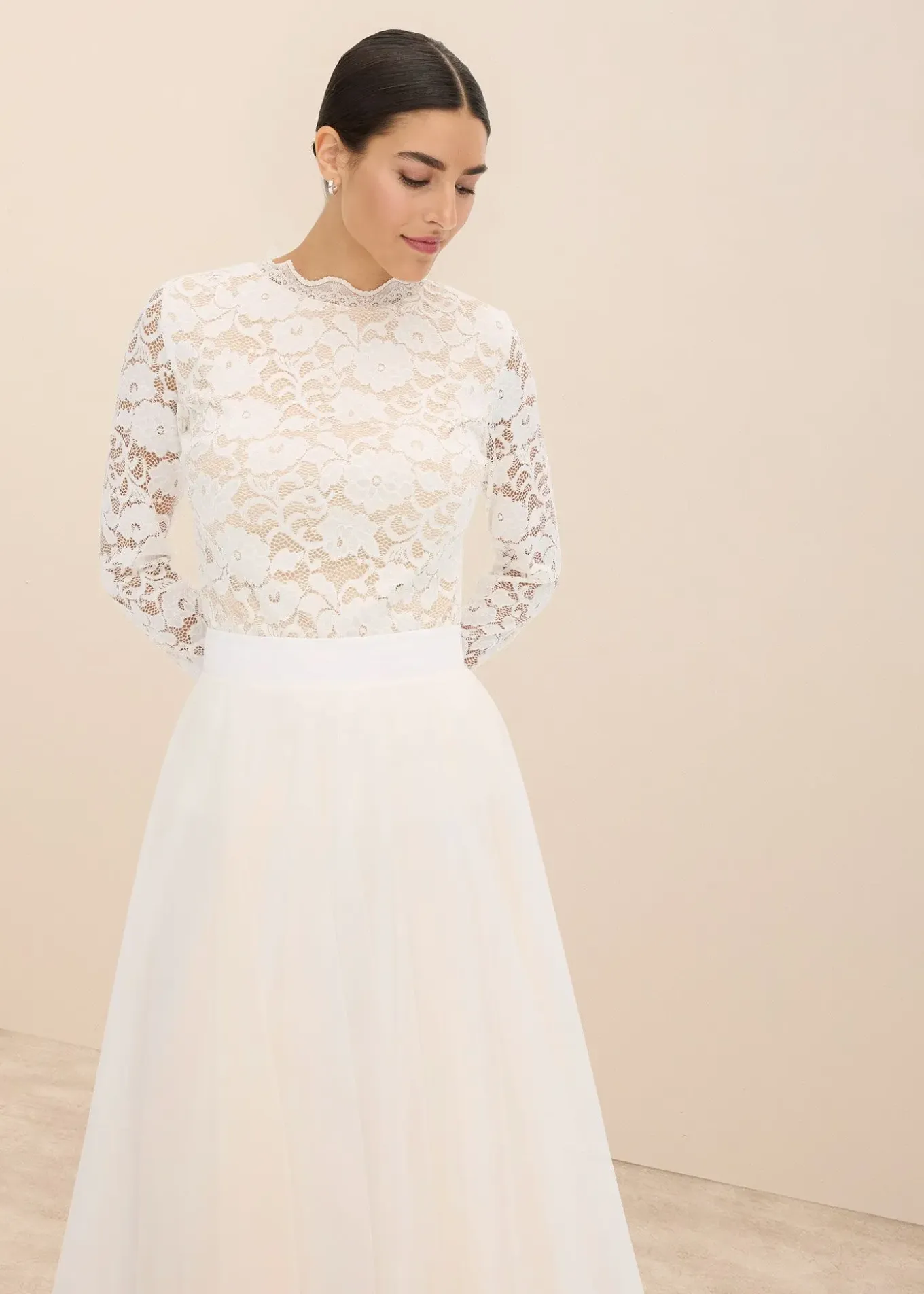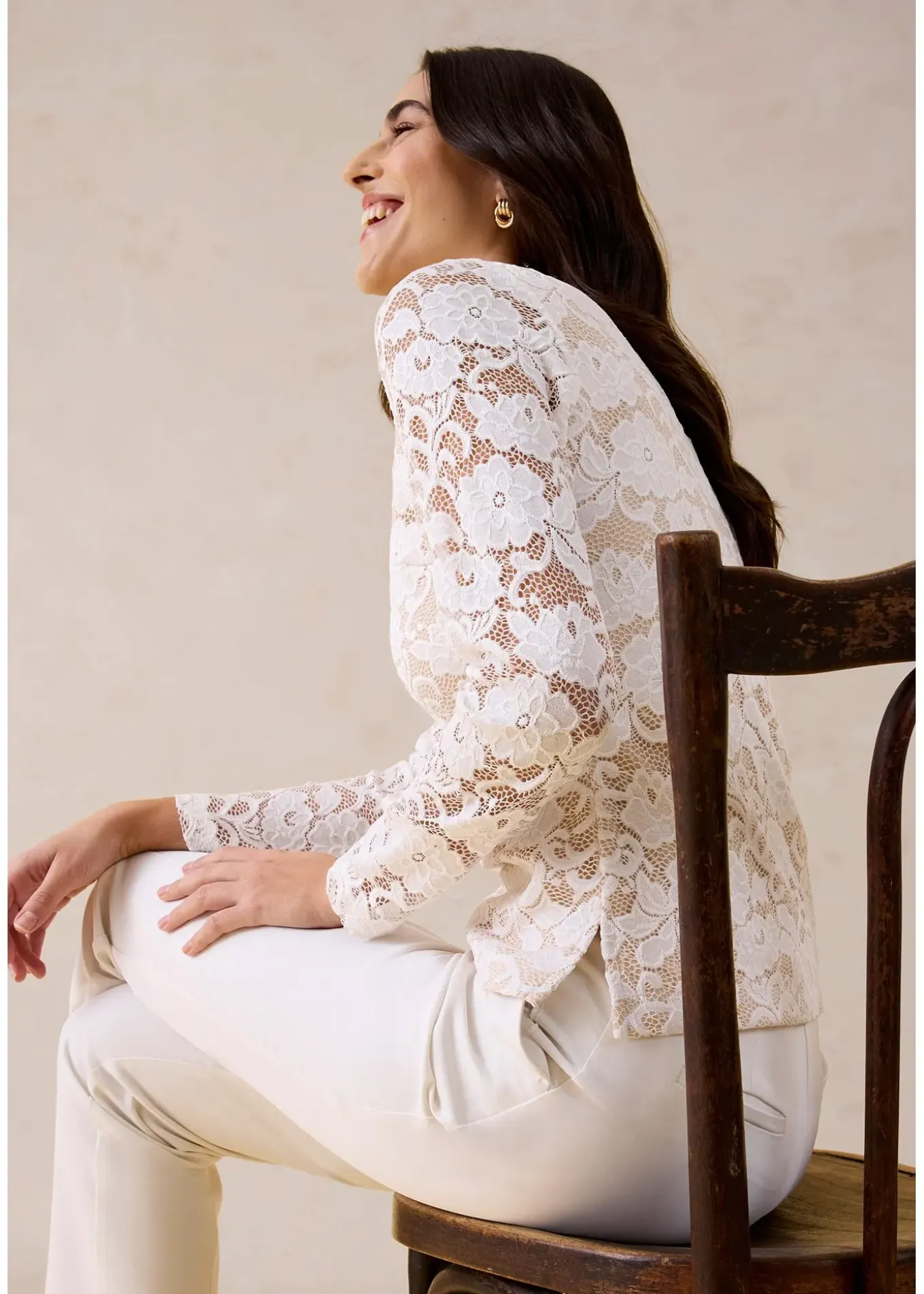 Haut manches longues romantique et féminin en dentelle florale avec une doublure couleur chair