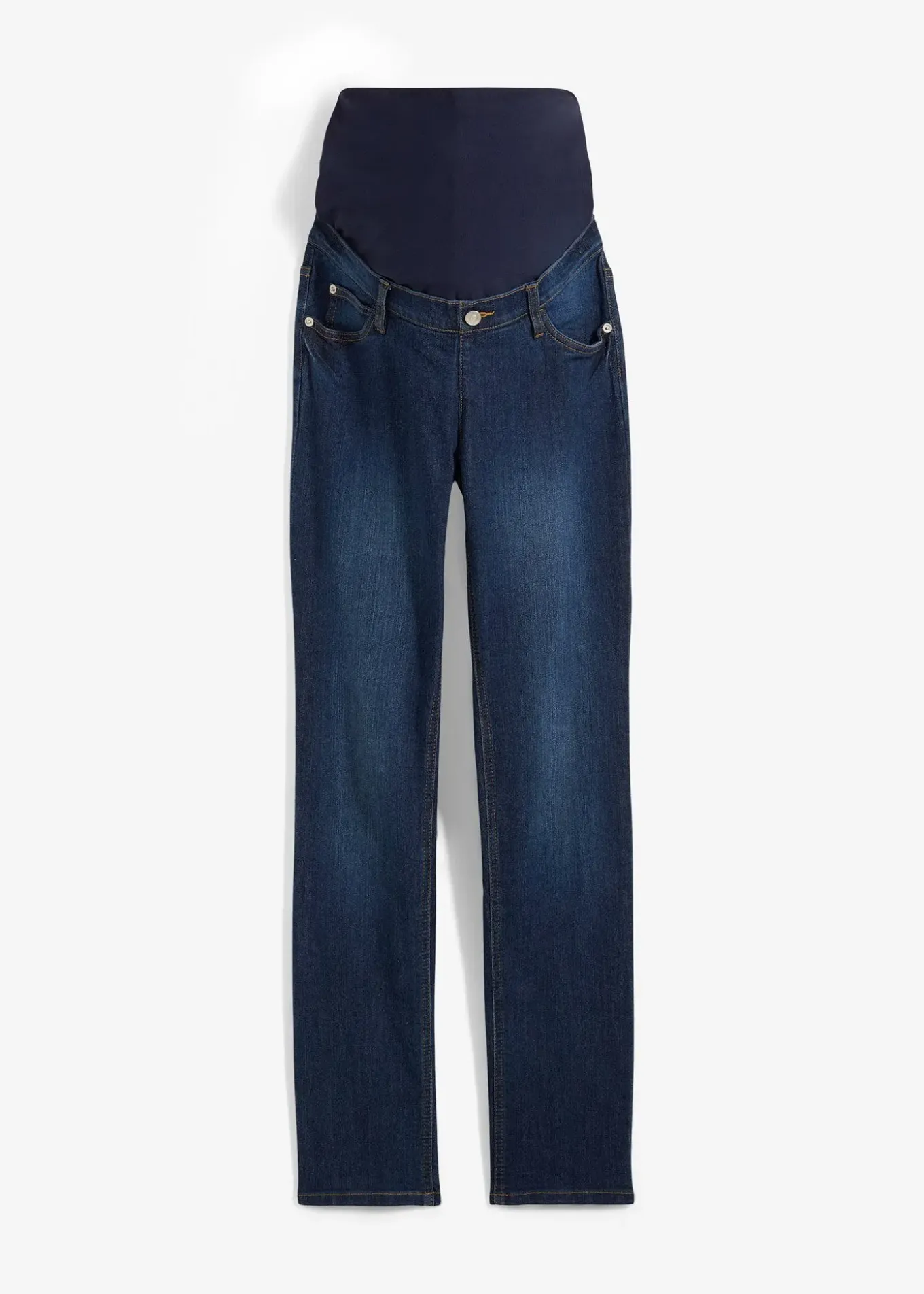 Jean 5 poches en denim coton extensible muni de poches devant et derrière. Coupe droite et longue. Large bandeau de grossesse en jersey coton pour un ajustement optimal à votre ventre qui s’arrondit. Ceinture réglable avec un élastique intérieur.