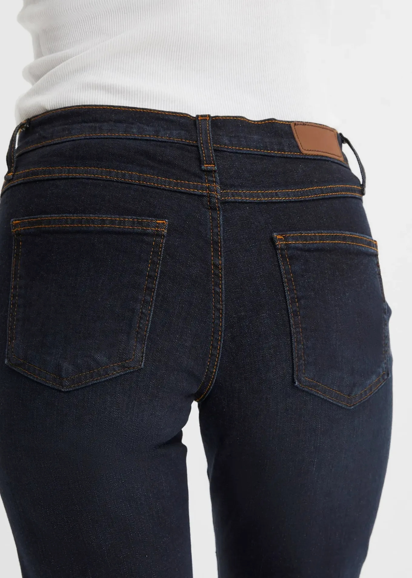 Jean extensible de la marque John Baner avec coutures avancées devant pour un effet amincissant. Taille mi-haute, style 5 poches, ampleur cuisses classique, jambes droites. Modèle facile à combiner avec de jolis hauts et des chaussures à talons.