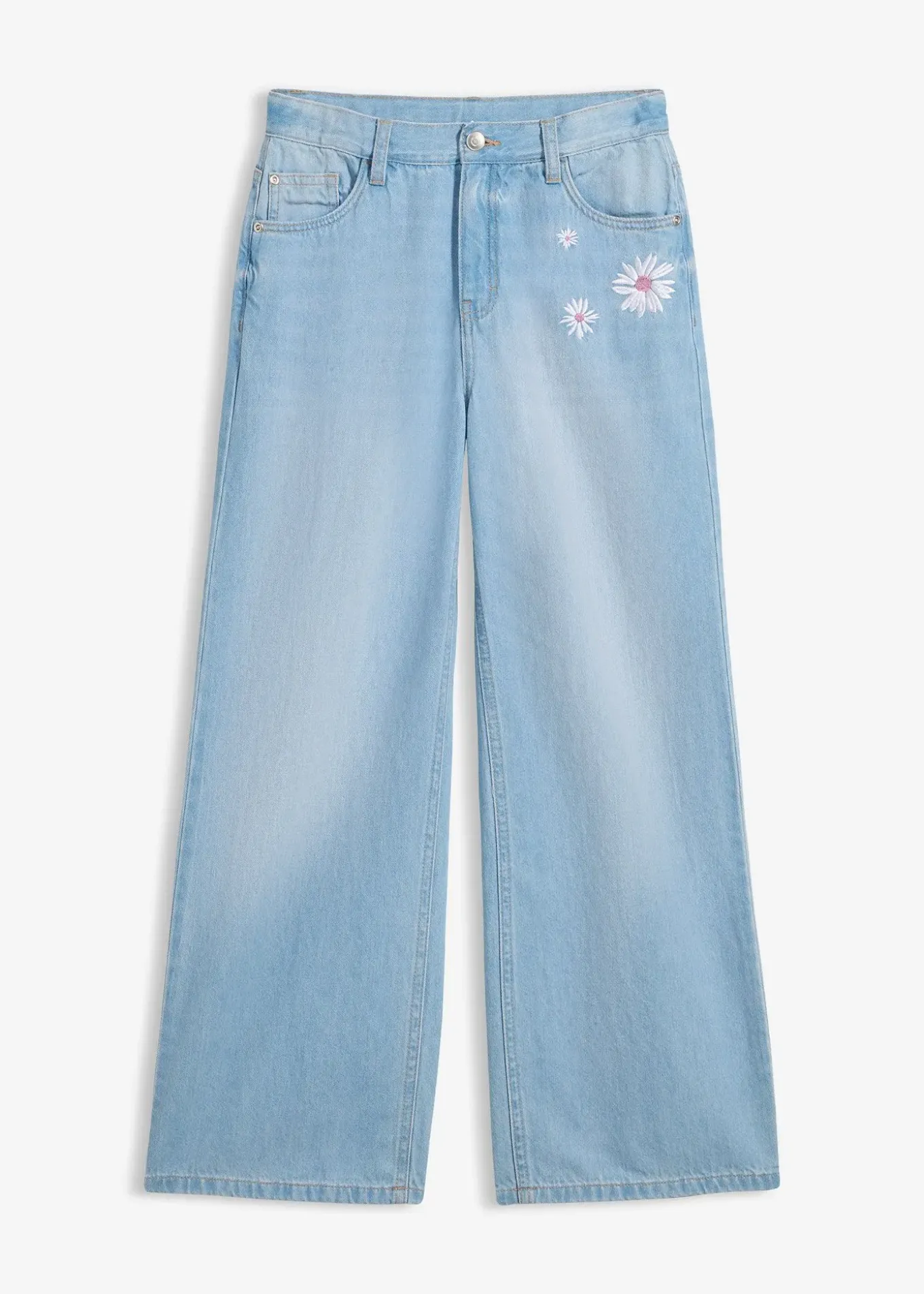 Jean large, long et décontracté avec délavage usé tendance et fleurs brodées