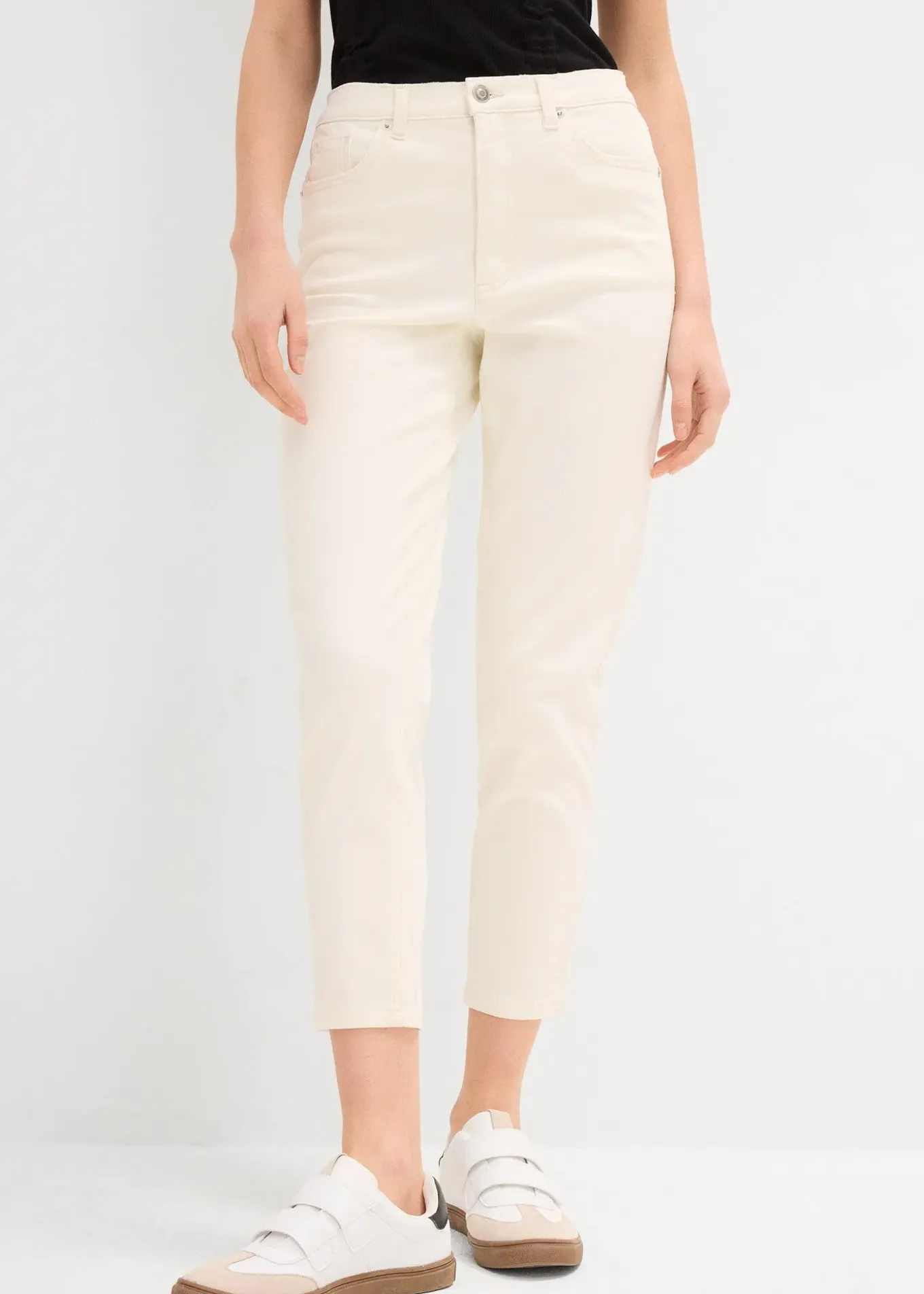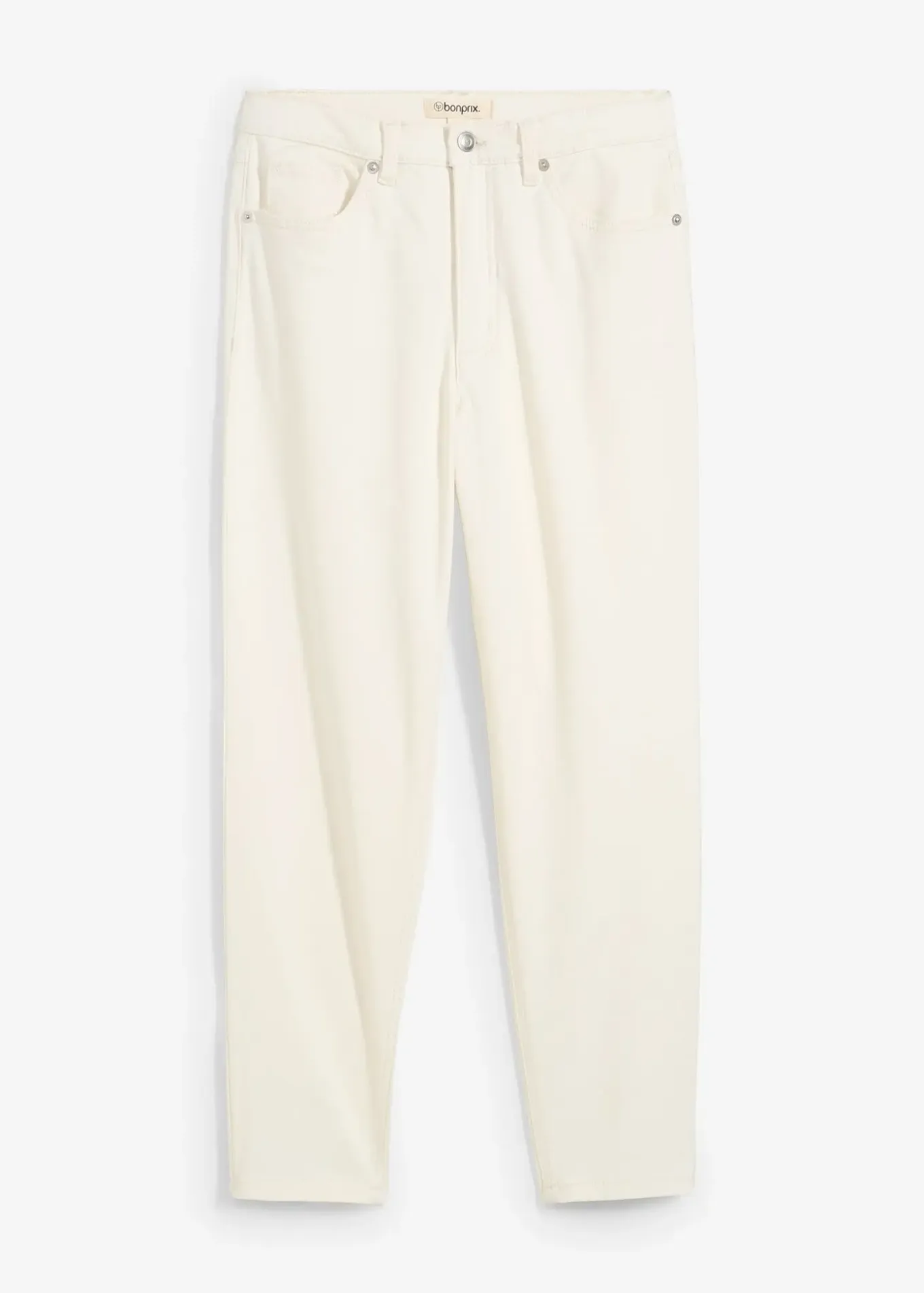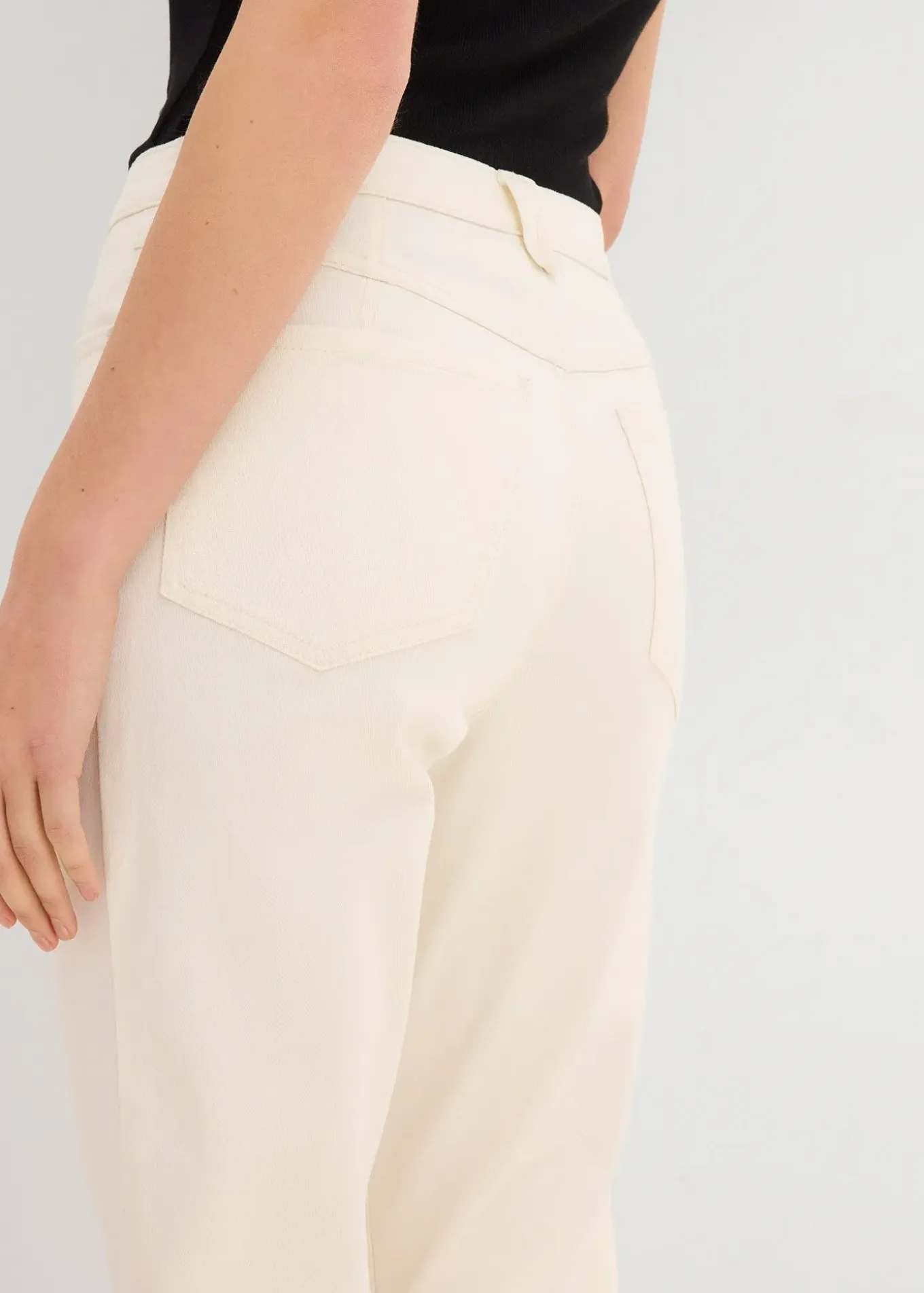 Jean 5 poches bleu clair en toile de coton rigide qui s’assouplit au fil des utilisations et lavages. Jean 5 poches écru en coton stretch.