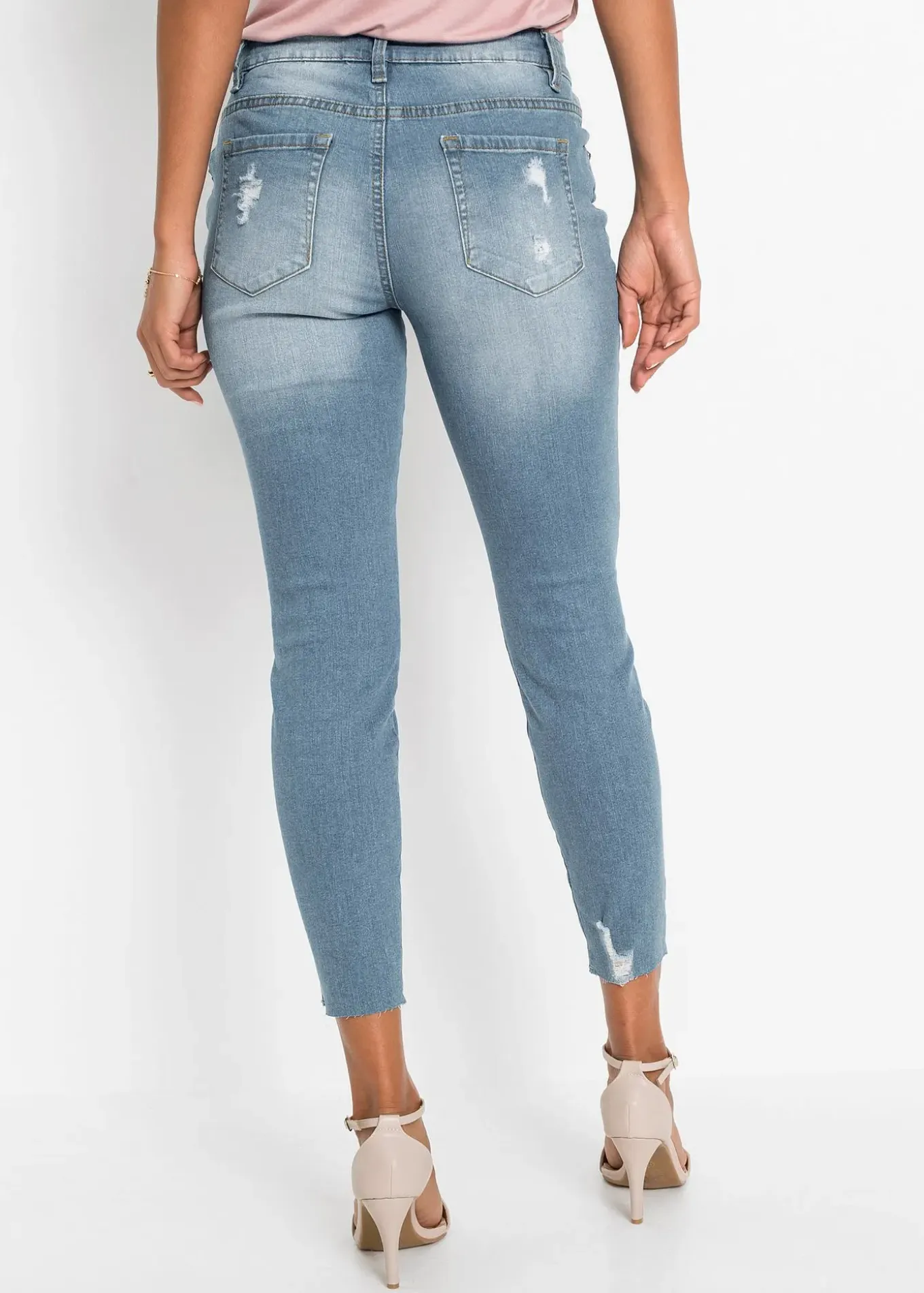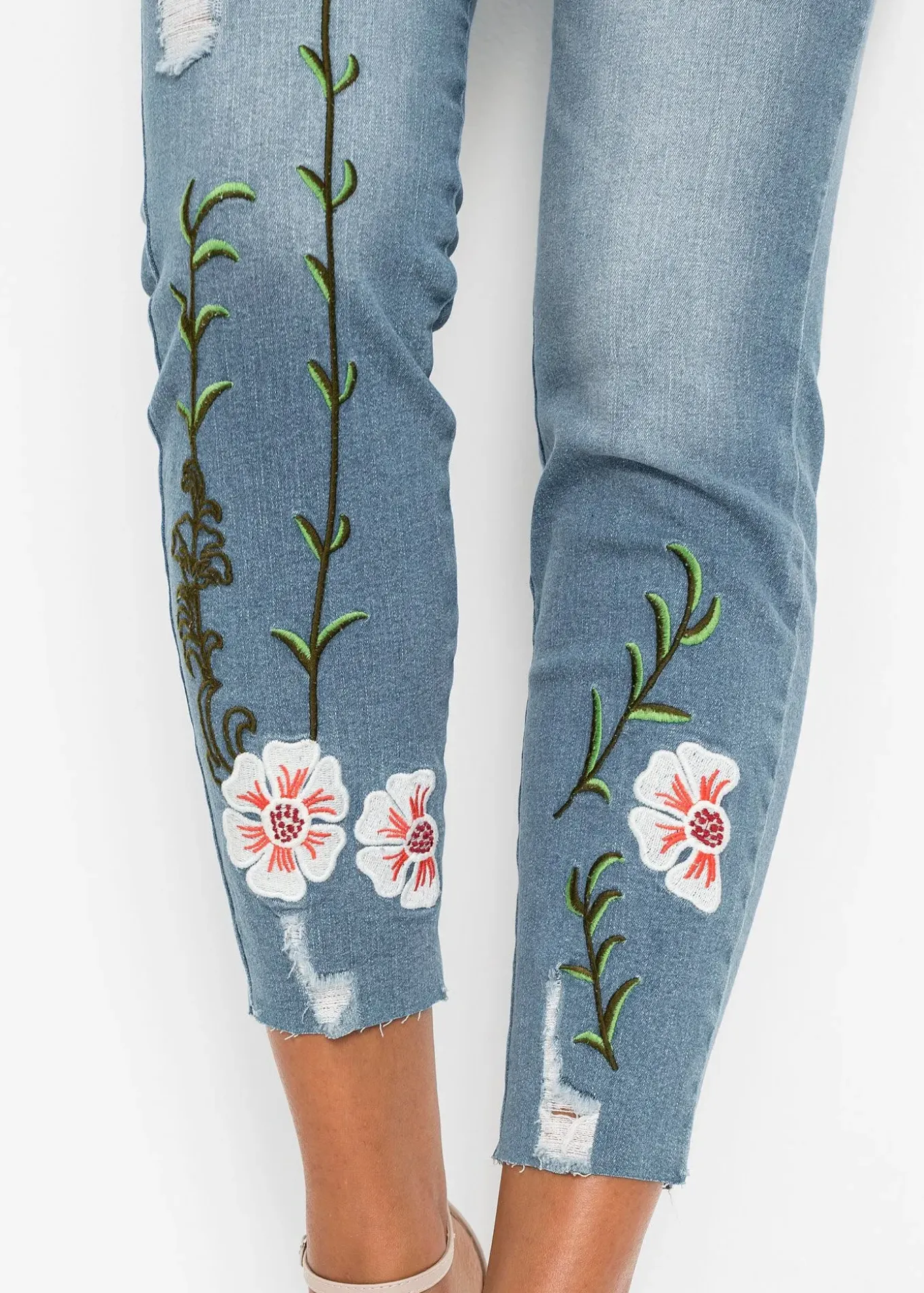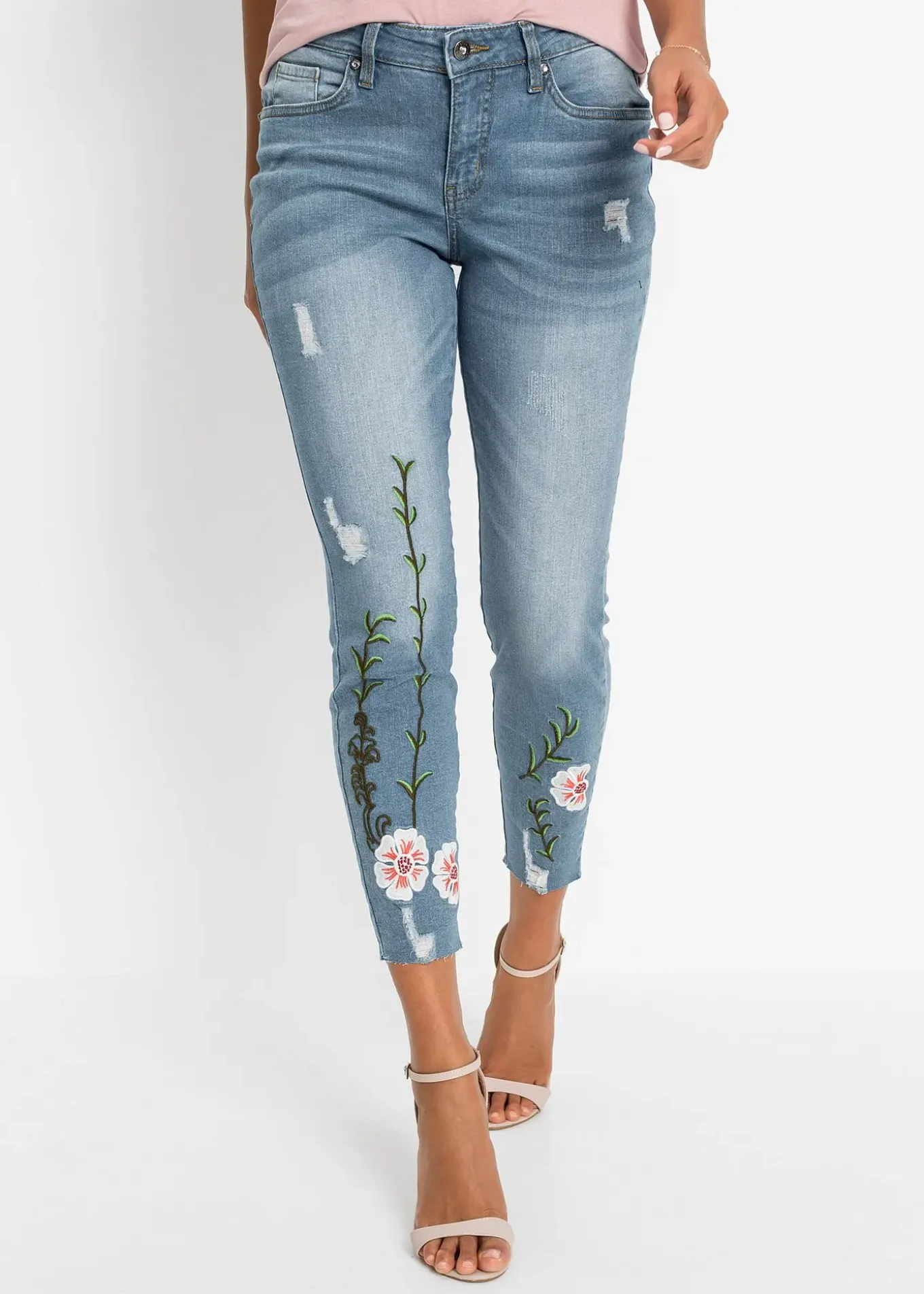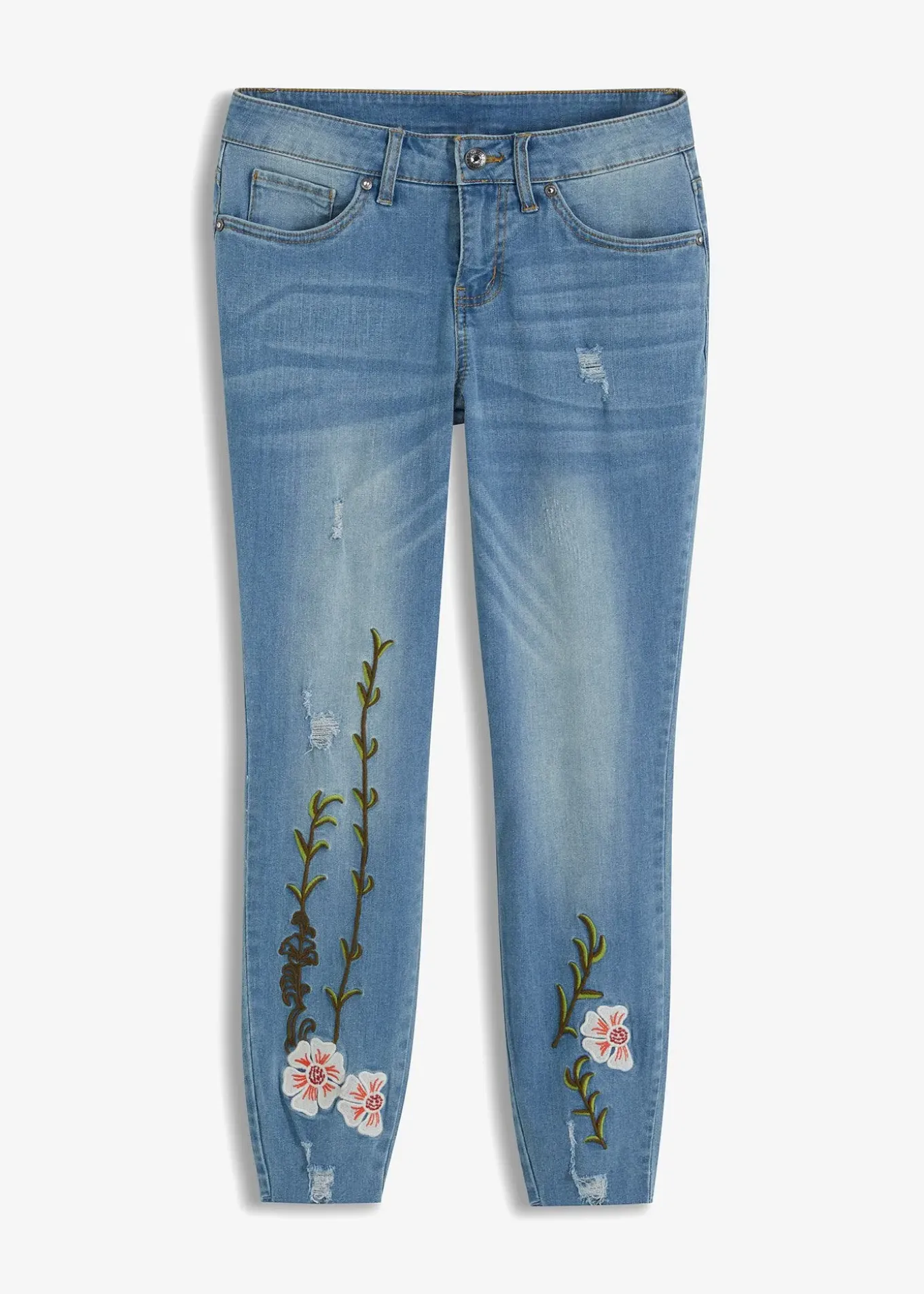 Jean skinny cinq poches de la marque BODYFLIRT avec de magnifiques broderies et de légers effets usés. Bordures à cru à la base.