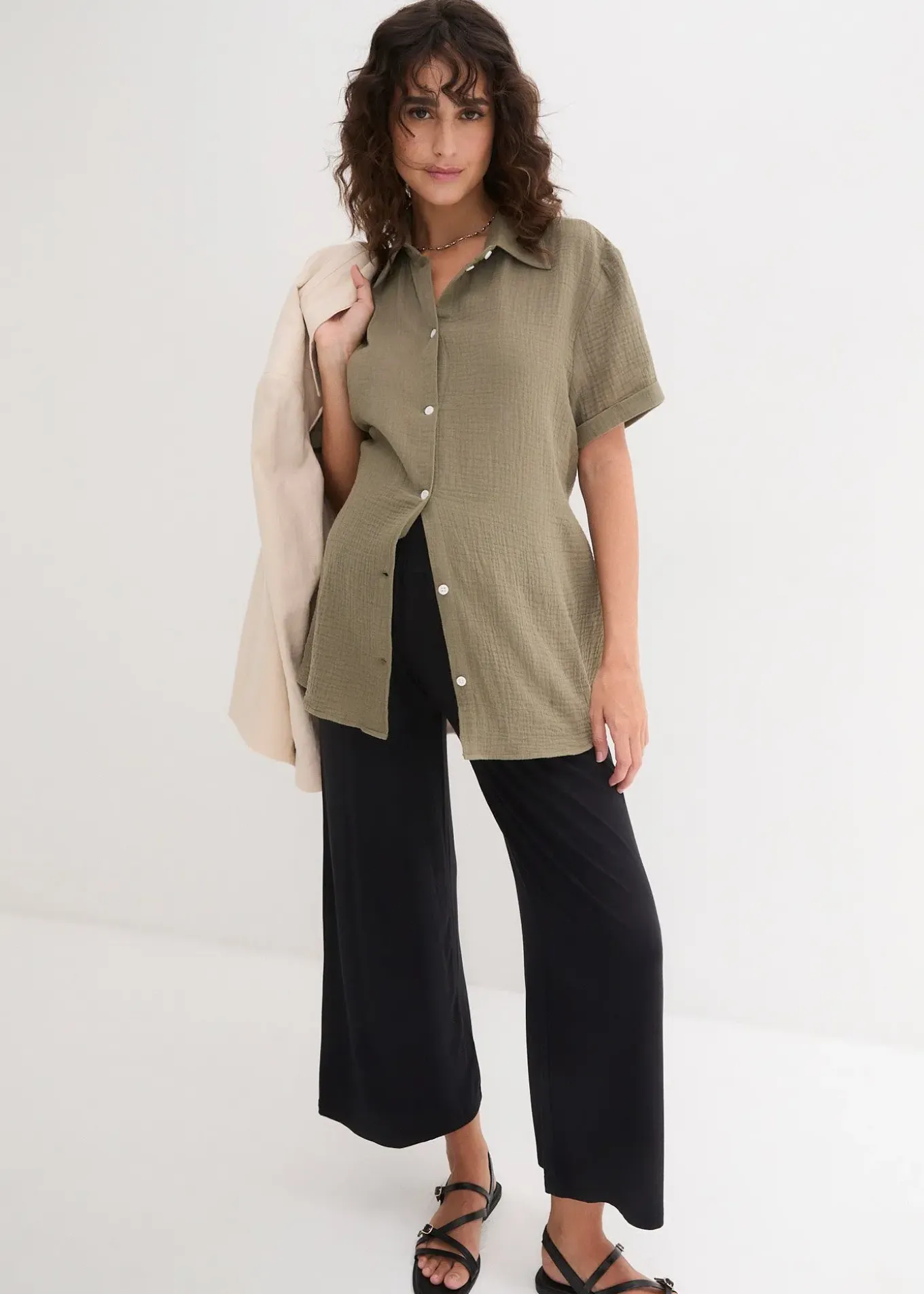 Pantalon doux en jersey viscose un peu extensible pour un grand confort avec une taille smockée qui s’adapte en douceur à chaque mois de grossesse. Poches pratiques sur le devant. Coupe confortable avec des jambes larges.