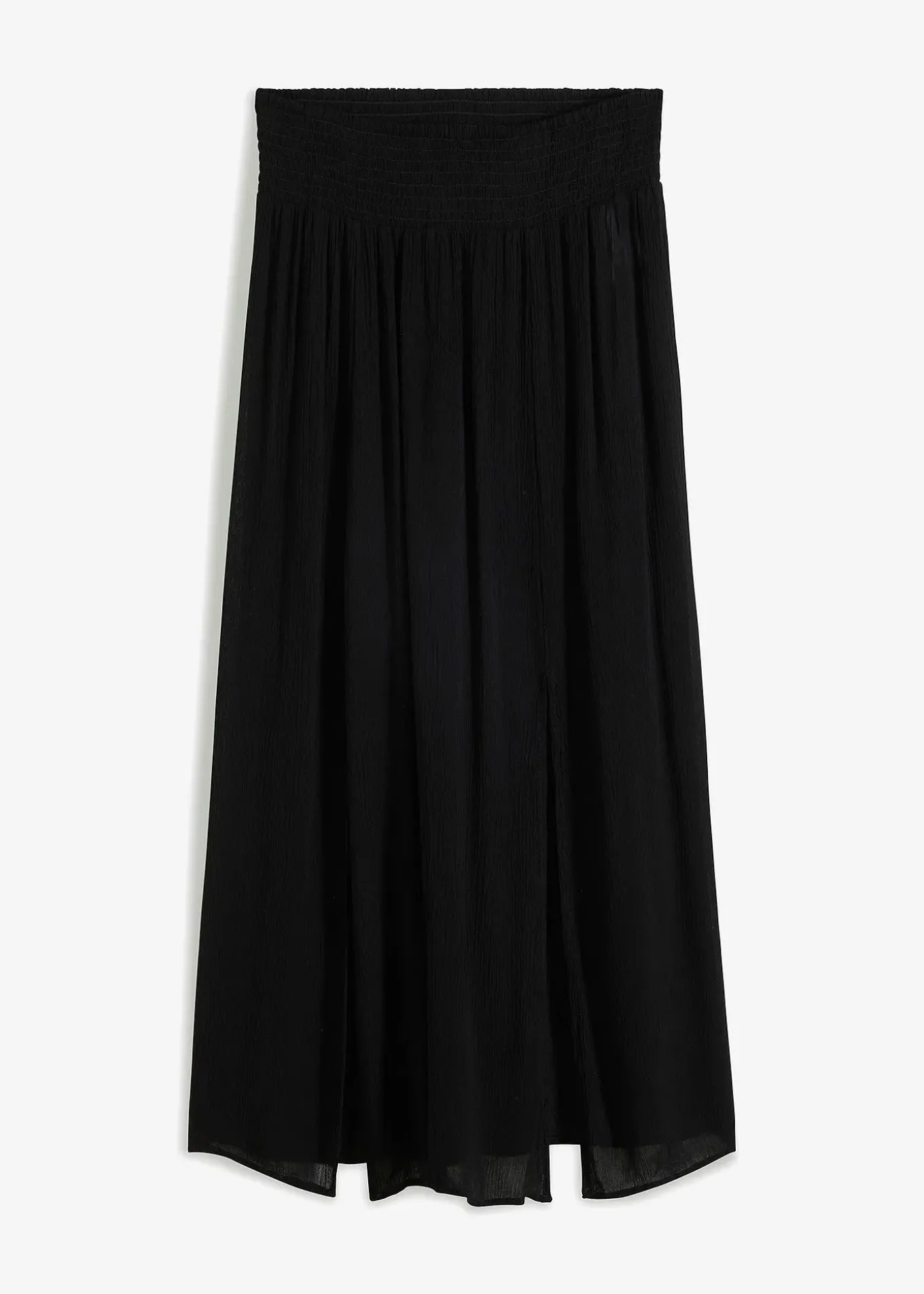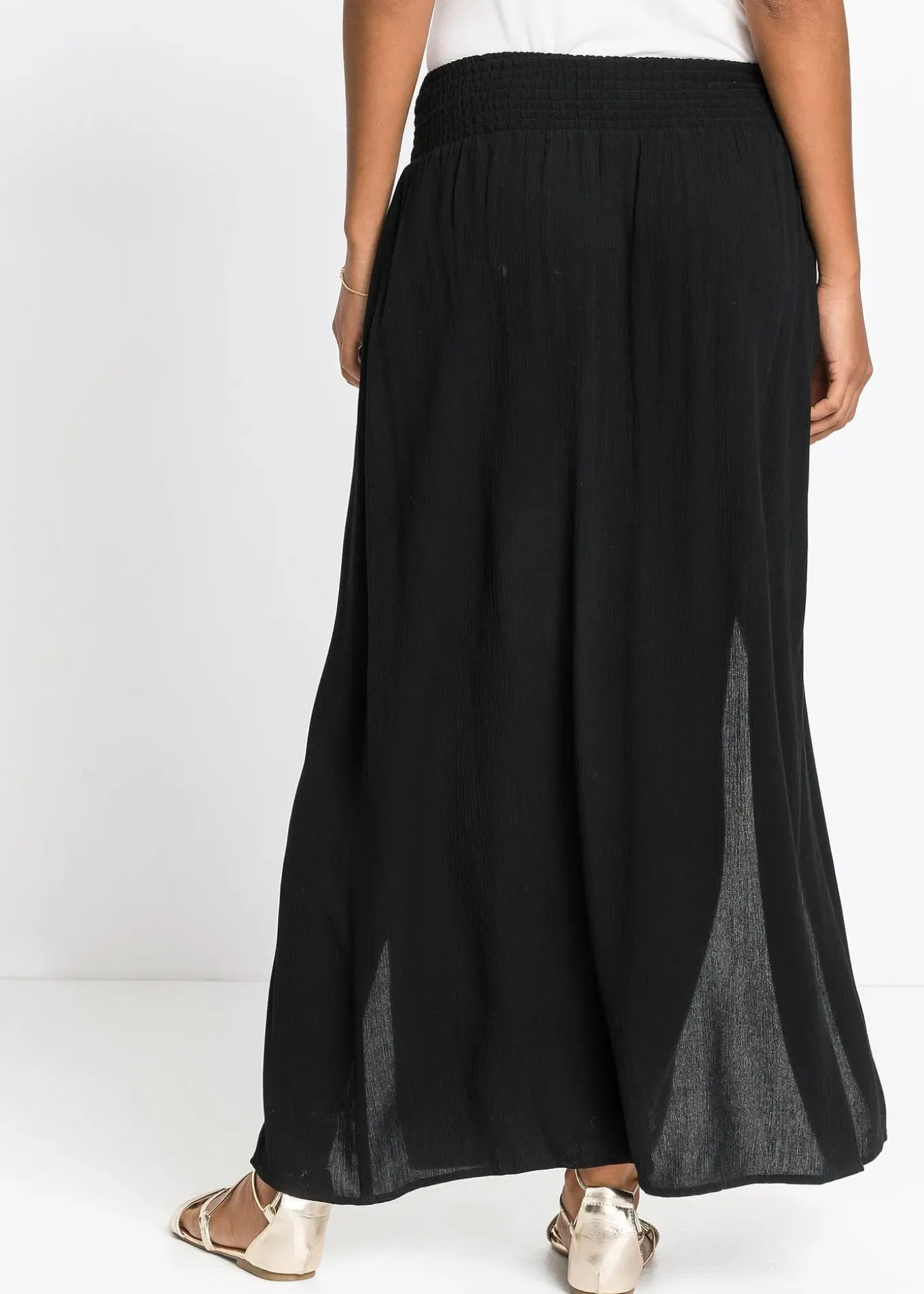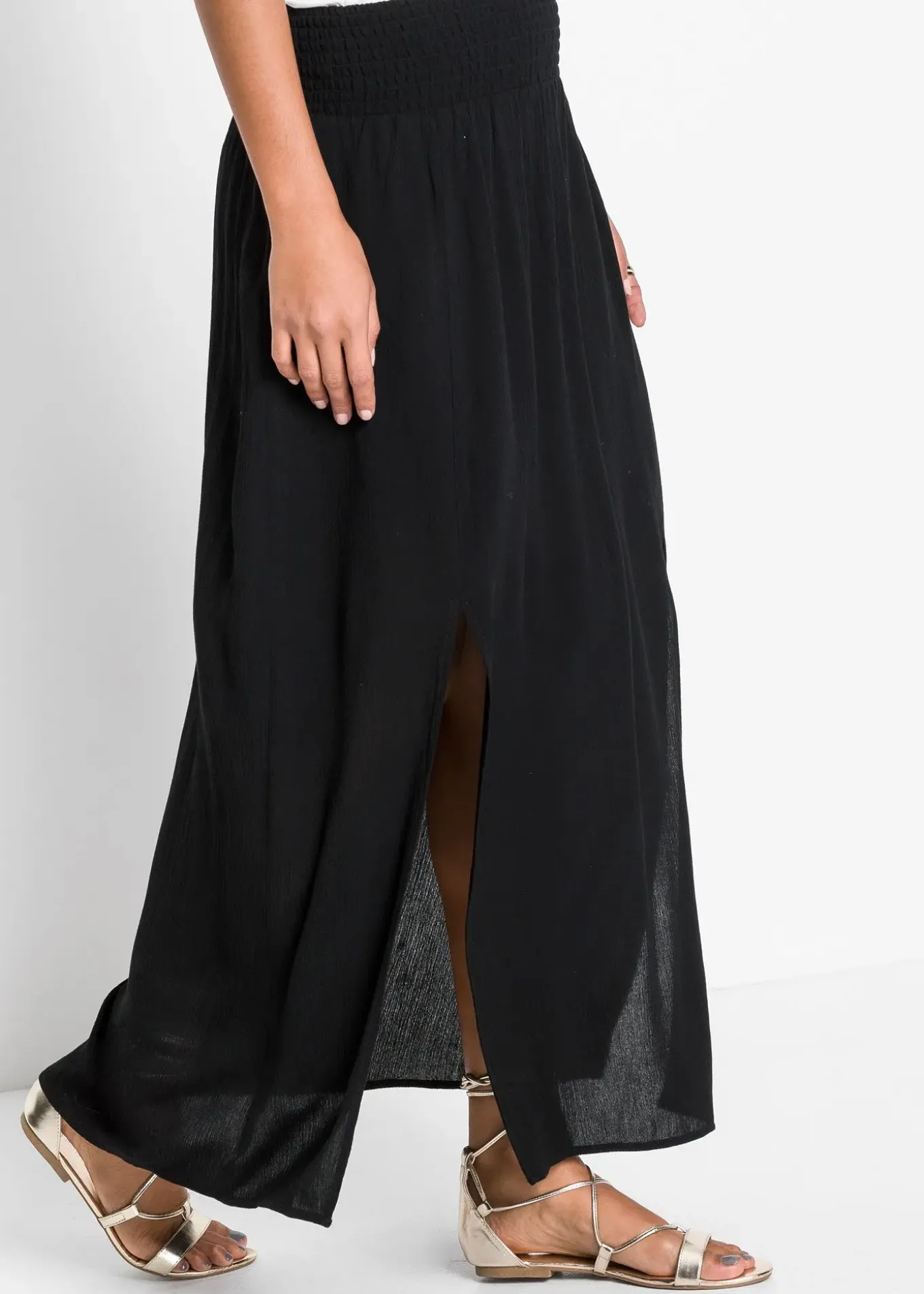 Jupe maxi longue tendance avec fentes mode sur les côtés et taille élastiquée. Proposée en coloris uni ou imprimé. Long. env. 92 cm, lavage machine.