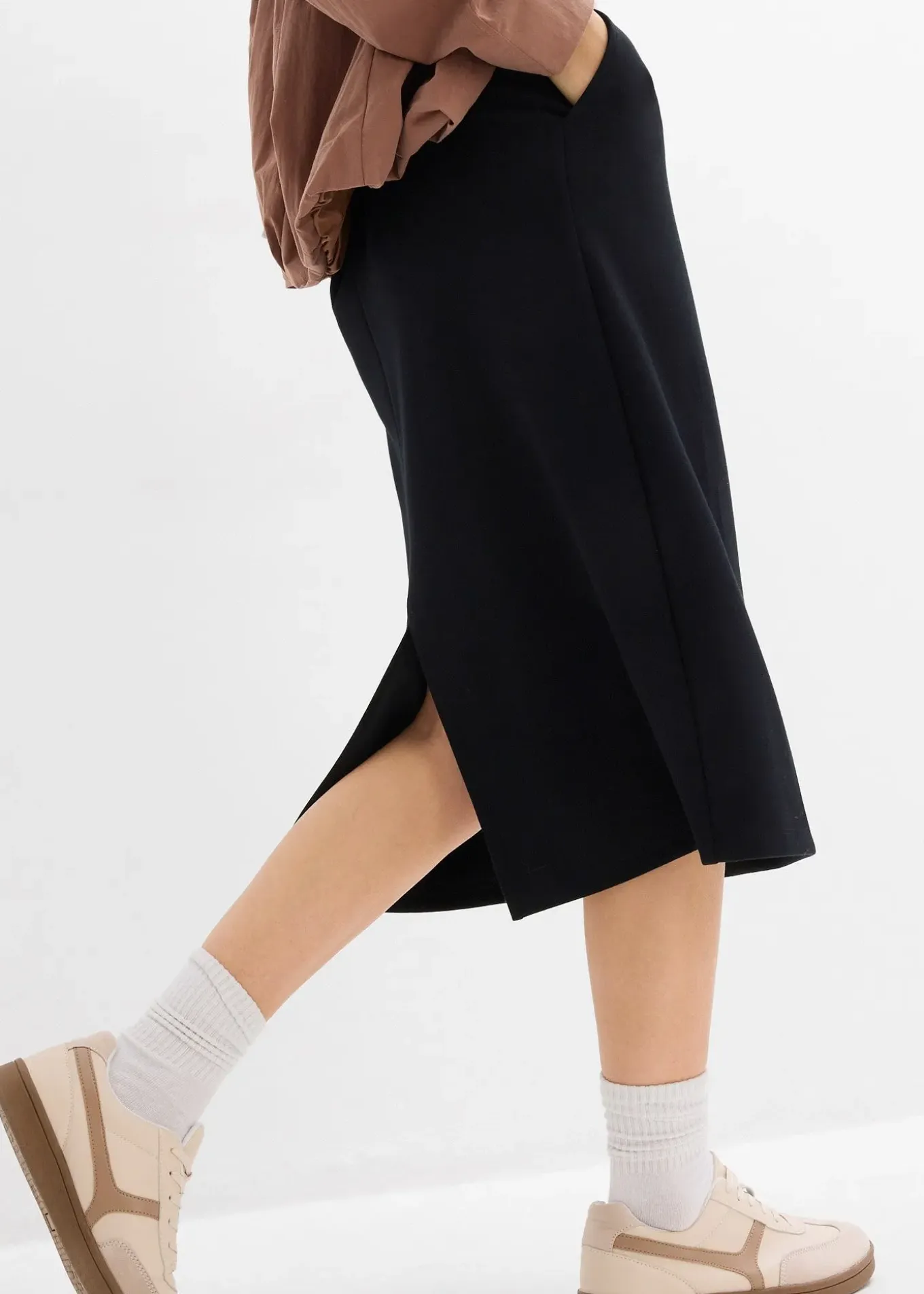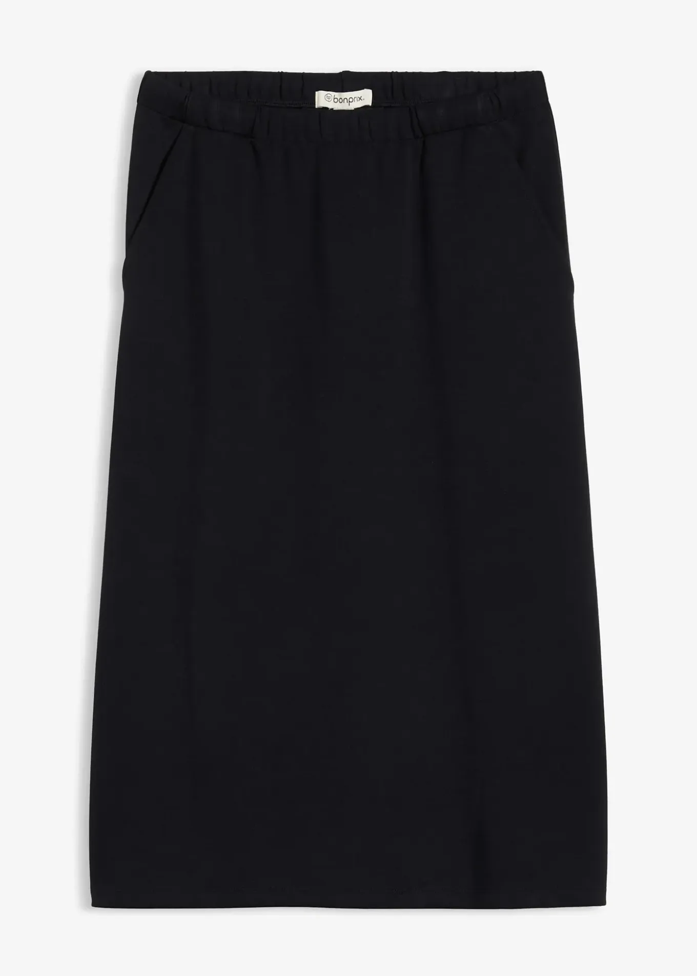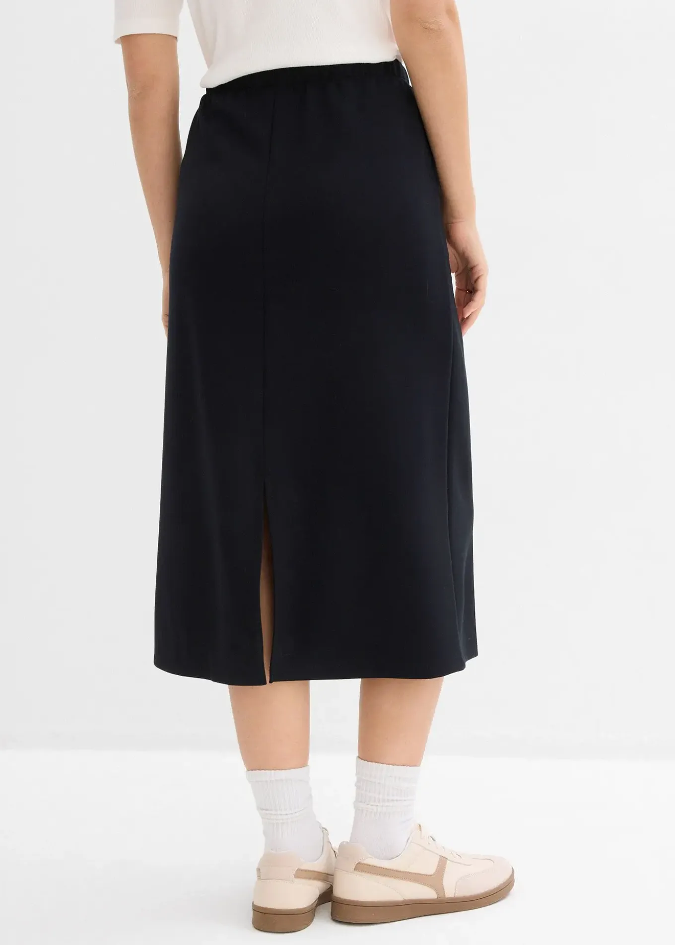 Jupe midi en matière douce. Taille élastiquée avec cordon de serrage et fente dos.