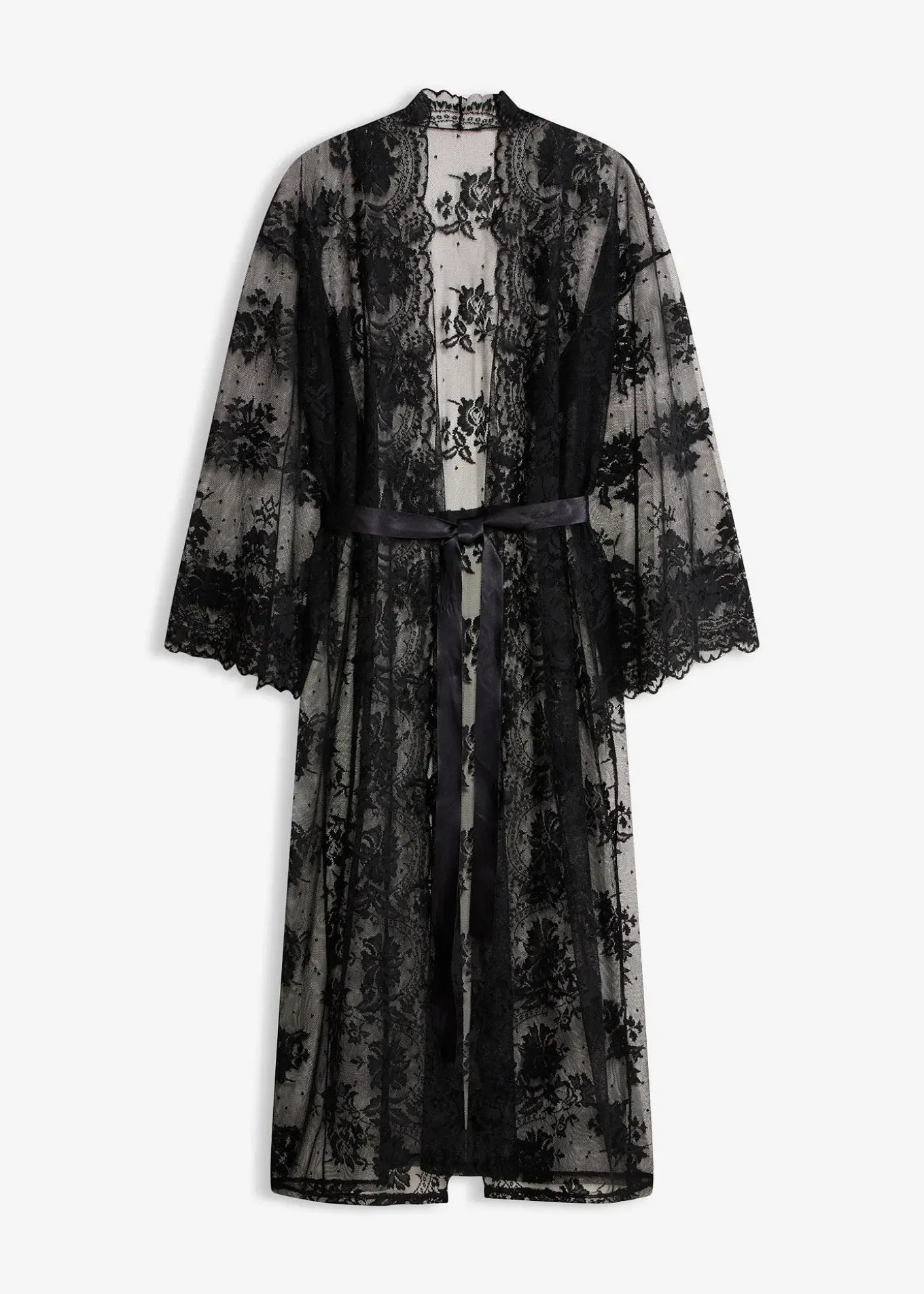 Le tissu transparent de ce long kimono épouse délicatement les courbes de votre corps. La peau nue se devine en transparence sous la dentelle raffinée. Ce kimono vous habille avec légèreté et élégance tout en dévoilant vos charmes. Il se porte comme robe de chambre, chemise de nuit ou tenue d’intérieur pour flâner le dimanche. Vous pourrez aussi le combiner avec des dessous et des talons hauts – votre partenaire va adorer !