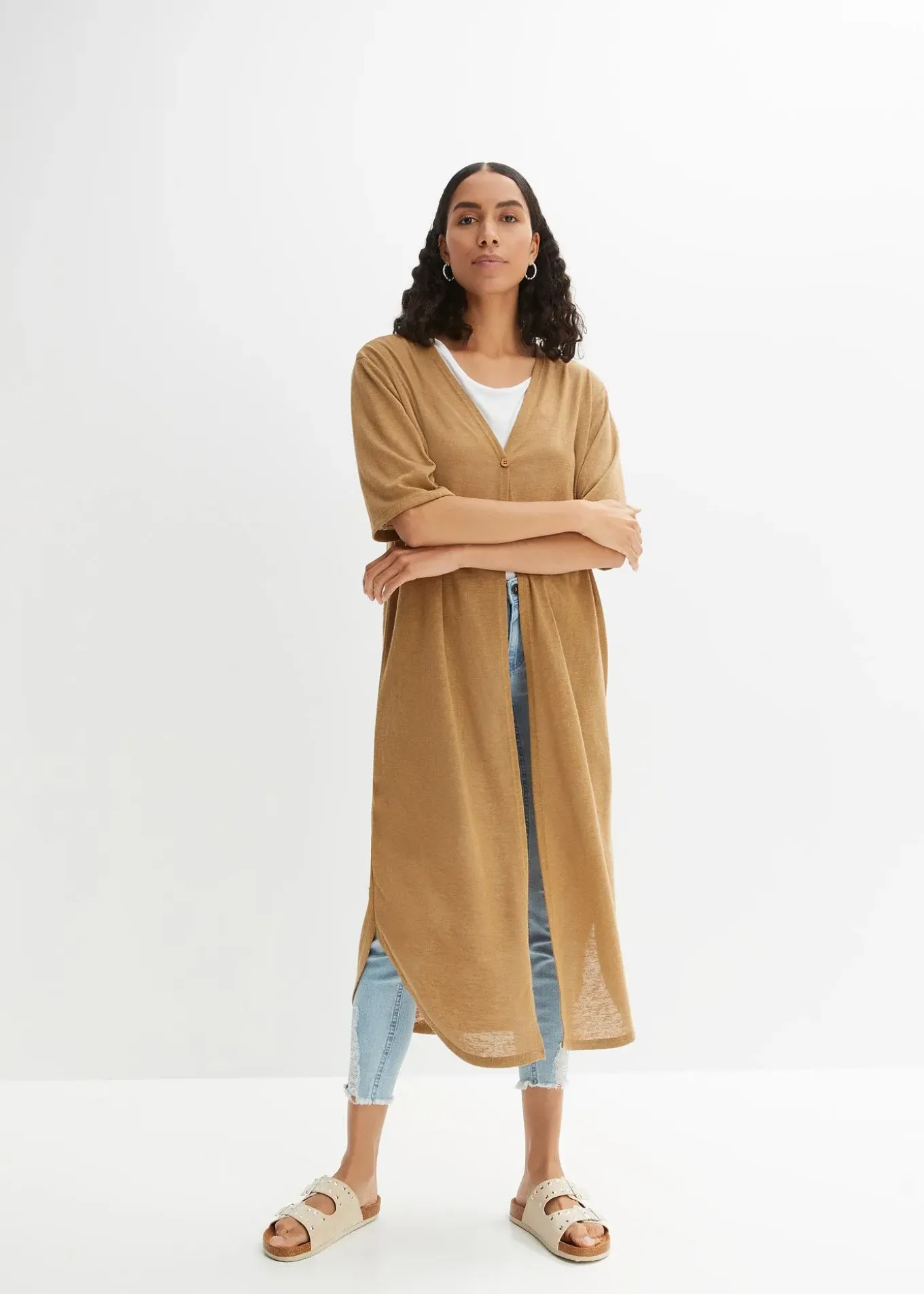 Long gilet ouvert aspect lin