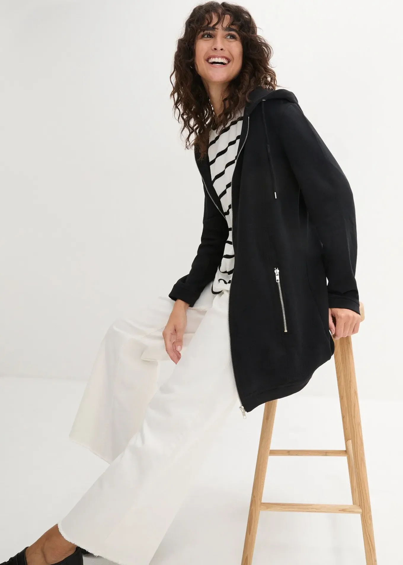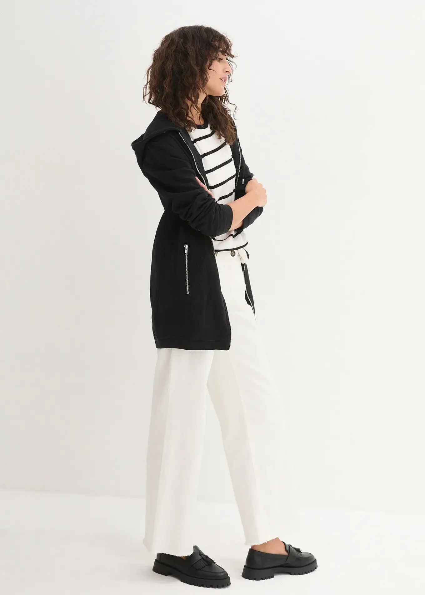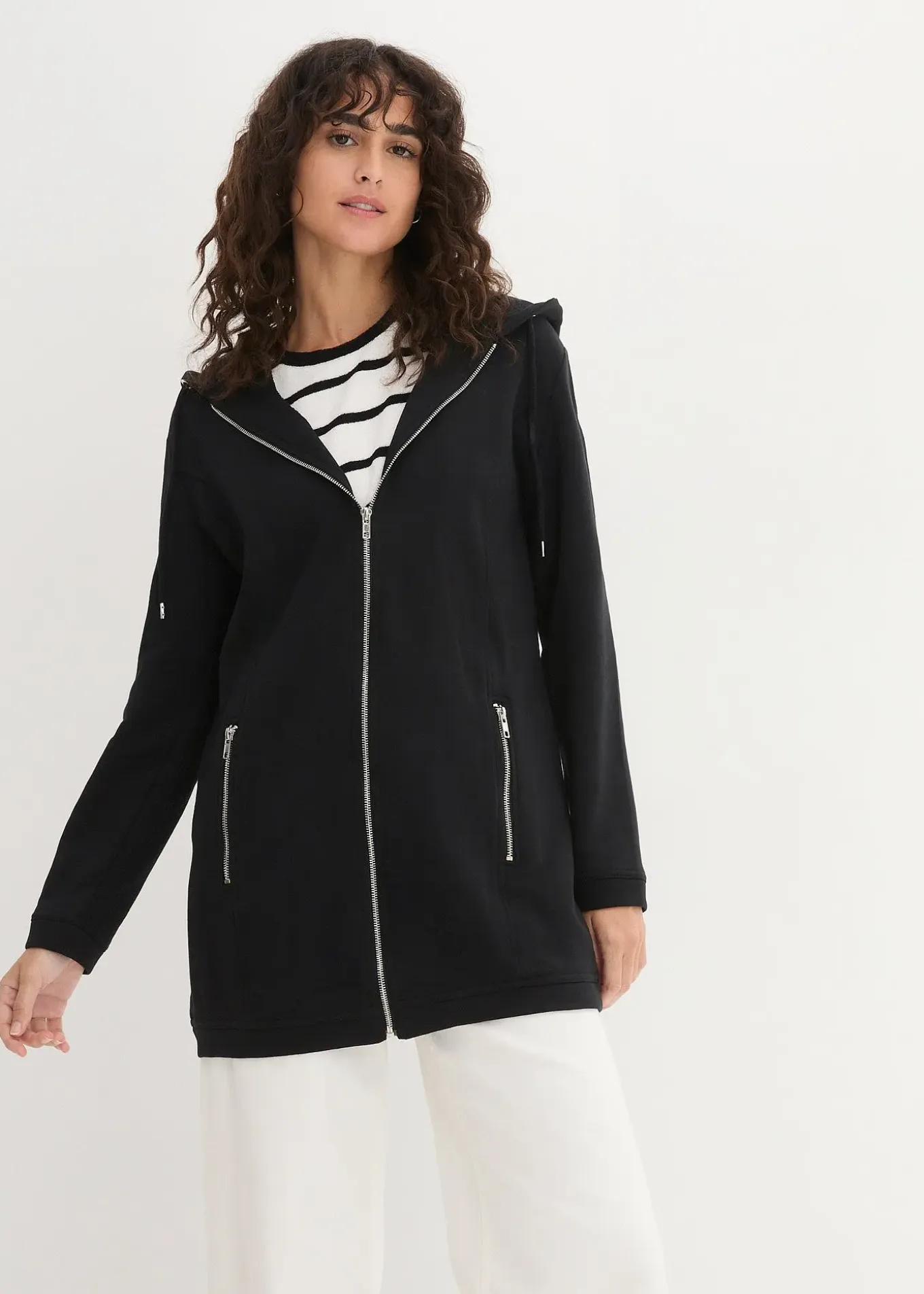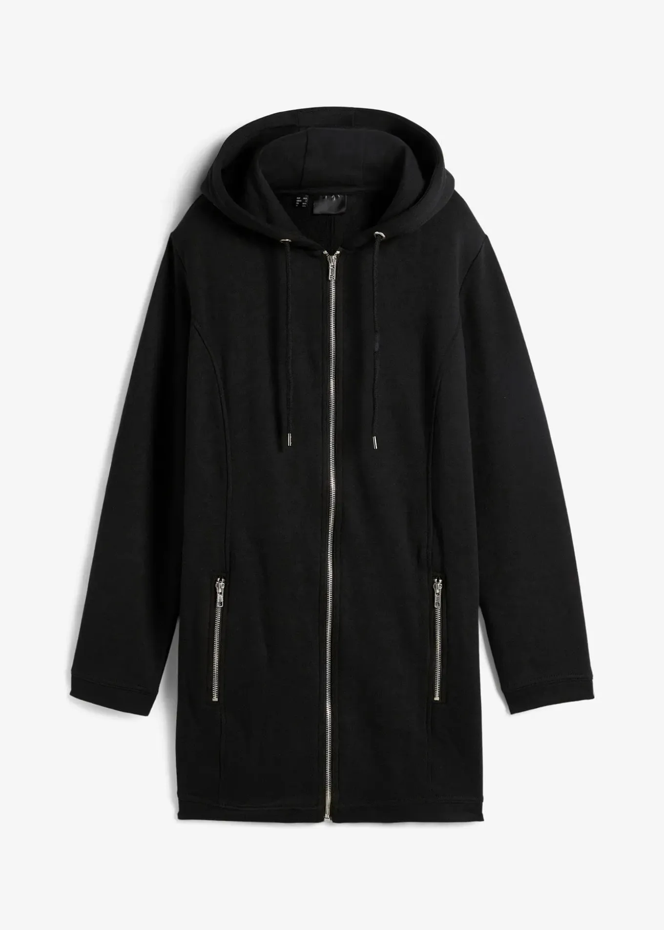 Long sweat zippé confortable à capuche et poches latérales