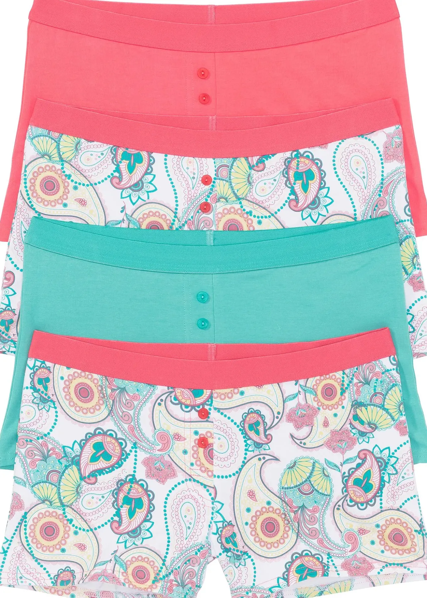 Lot de 4 boxers femme en coton extensible avec taille élastique et fausse ouverture.