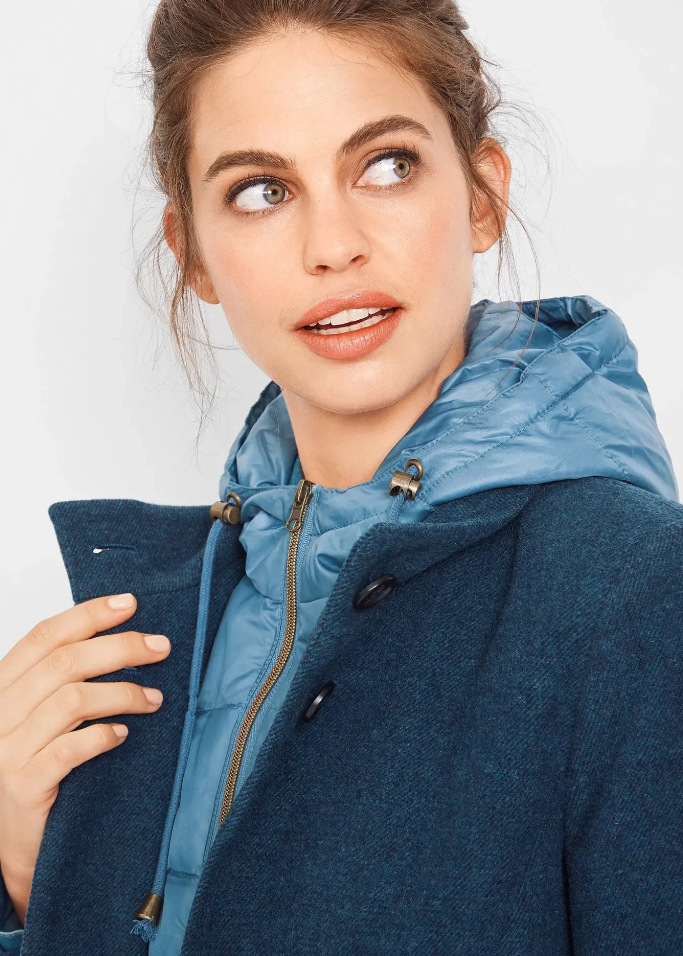 Manteau d’hiver tendance, style 2en1. Coupe classique et empiècement matelassé. Manteau de dessus épuré, fermé par des boutons décoratifs.