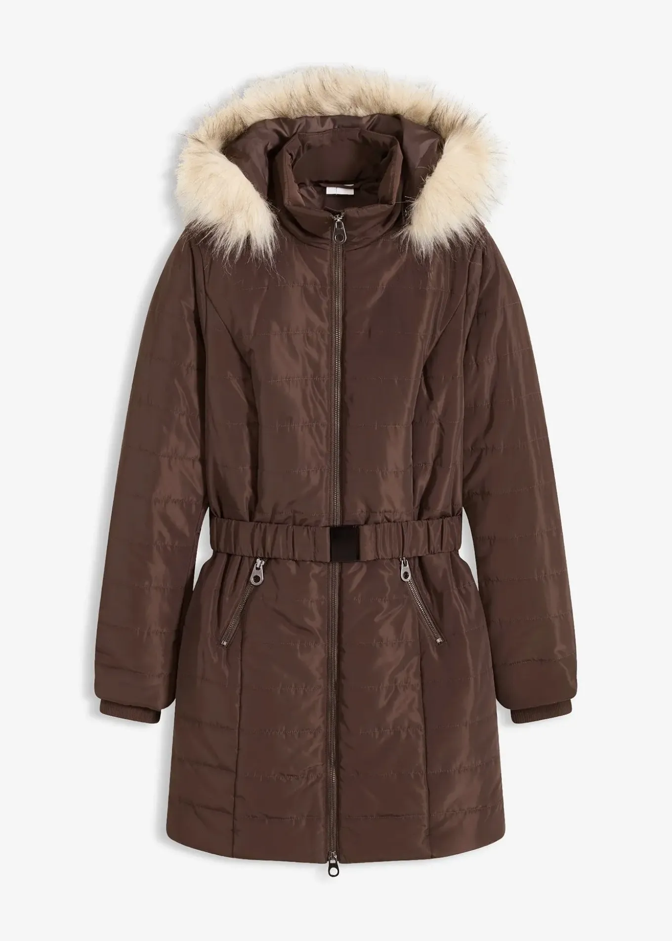 La synthétique imitation fourrure à la capuche est fixée par des boutons pression et amovible si besoin.