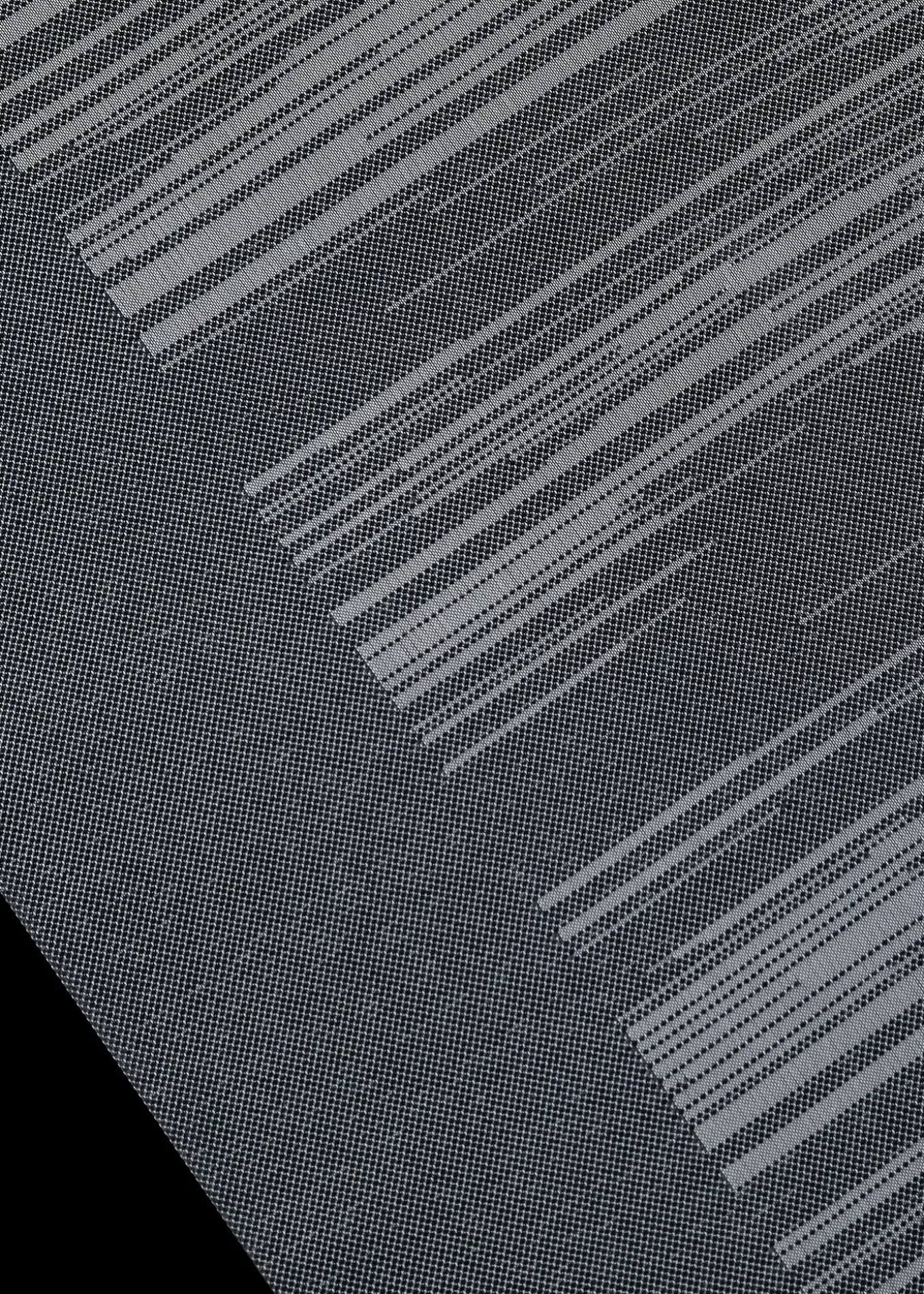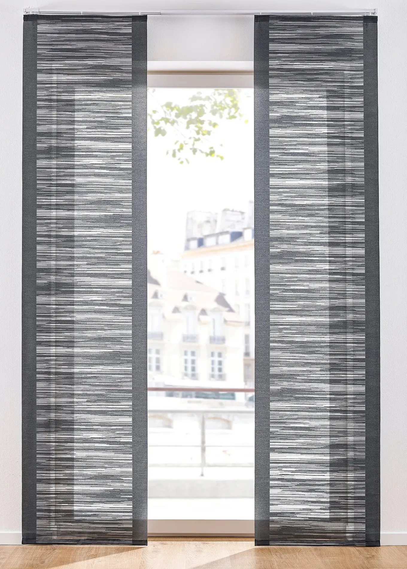 Panneau coulissant moderne en matière semi-transparente. Motif rayé réalisé selon la technique du broché avec une finition effilochée tendance. Différents coloris au choix.
