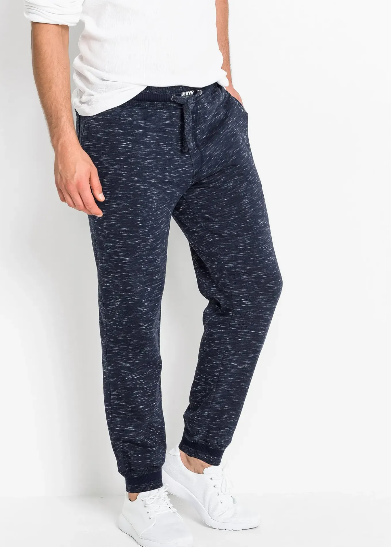 Pantalon de jogging pour homme de la collection bpc en molleton chiné. Taille élastiquée avec cordon. Bas de jambes côtelés avec bande contrastante.