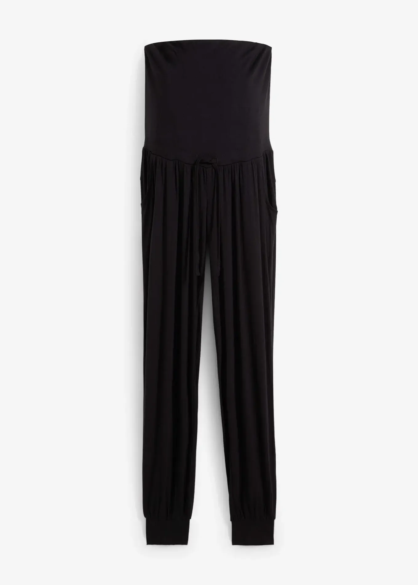 Pantalon en viscose avec jambe droite et base élastique. Large ceinture à revers pour une coupe confortable pendant et après la grossesse.