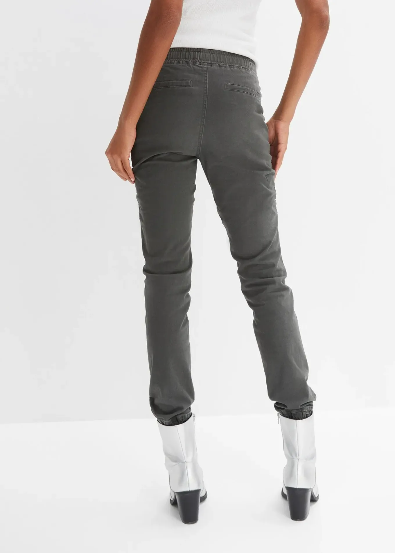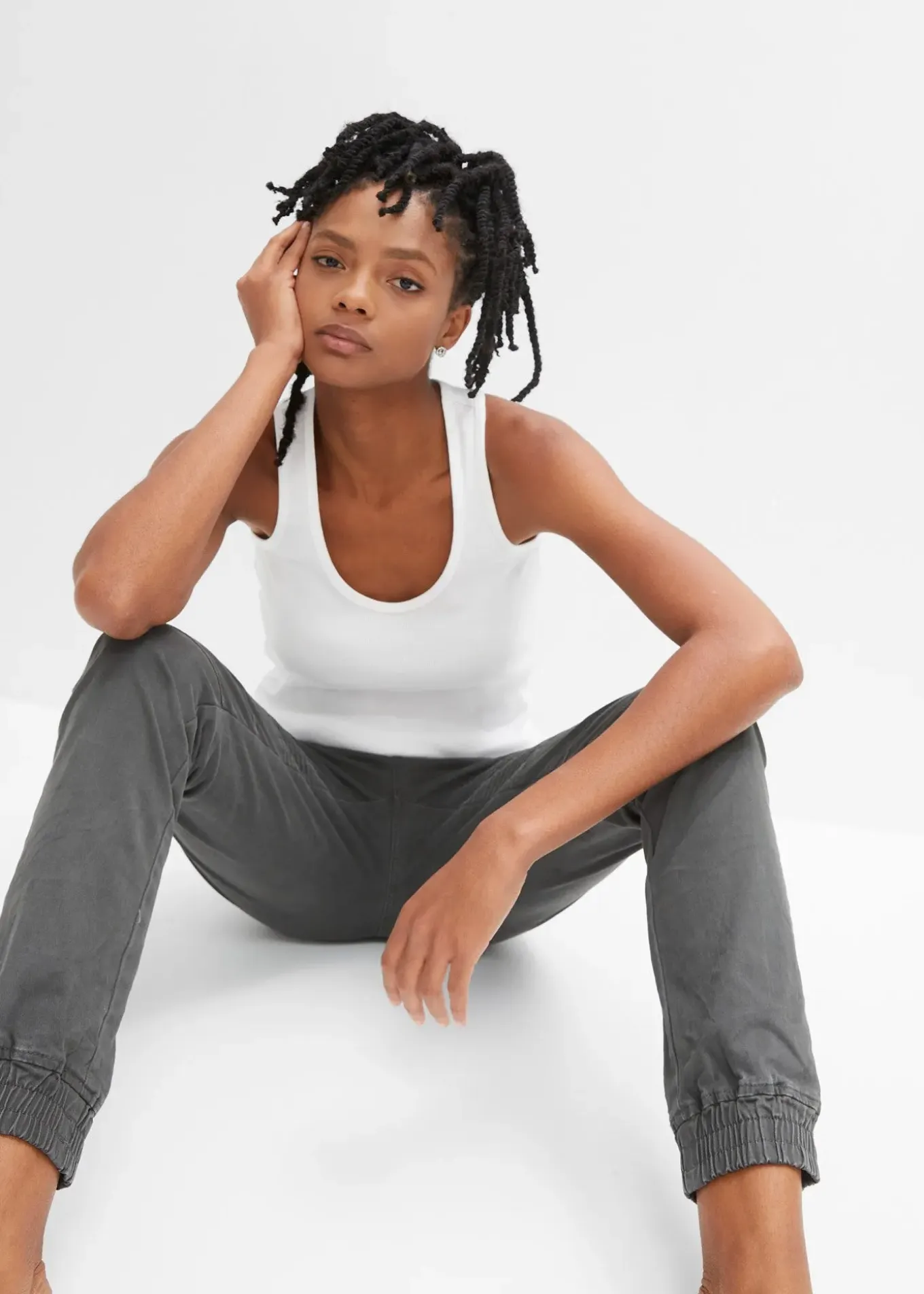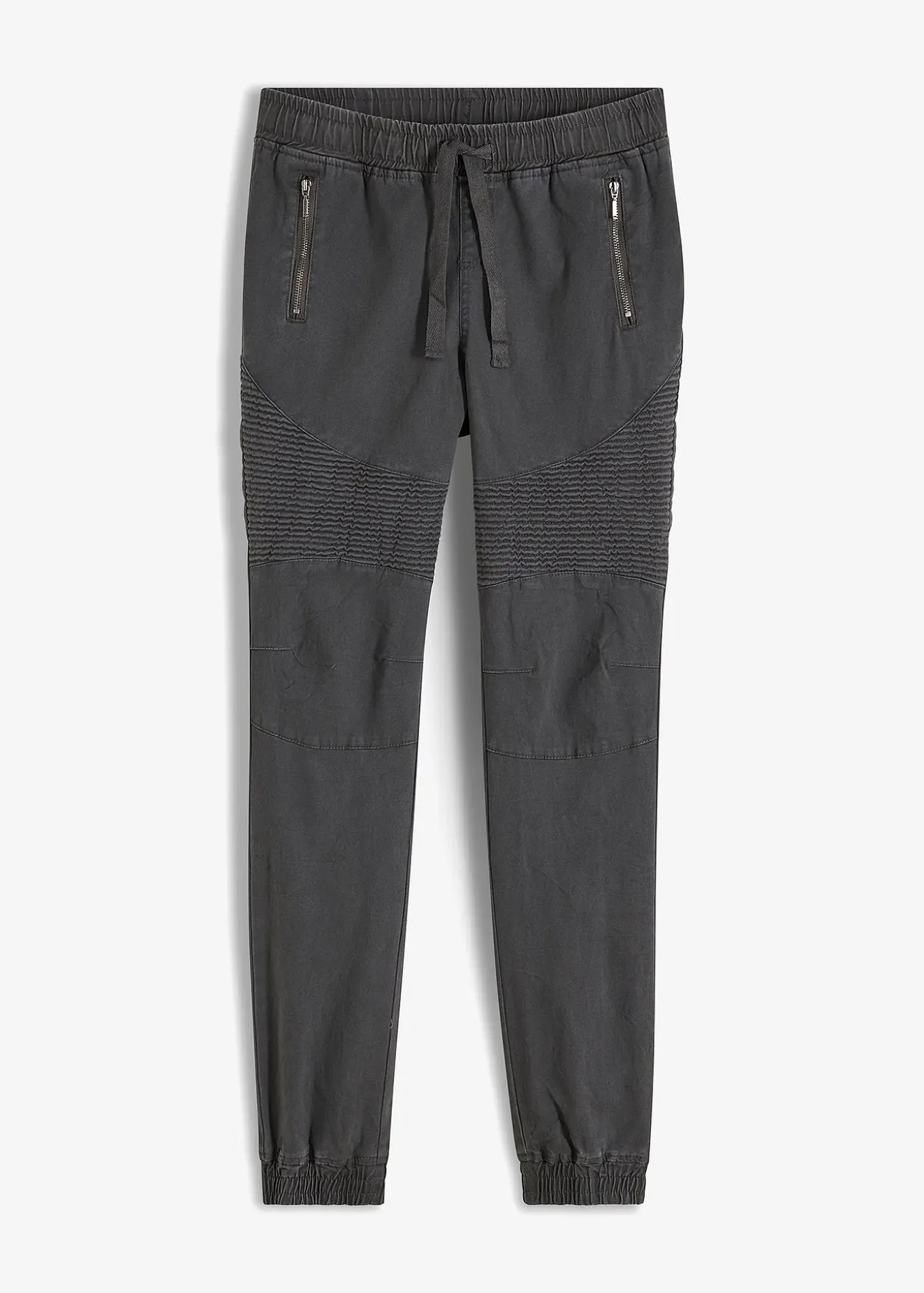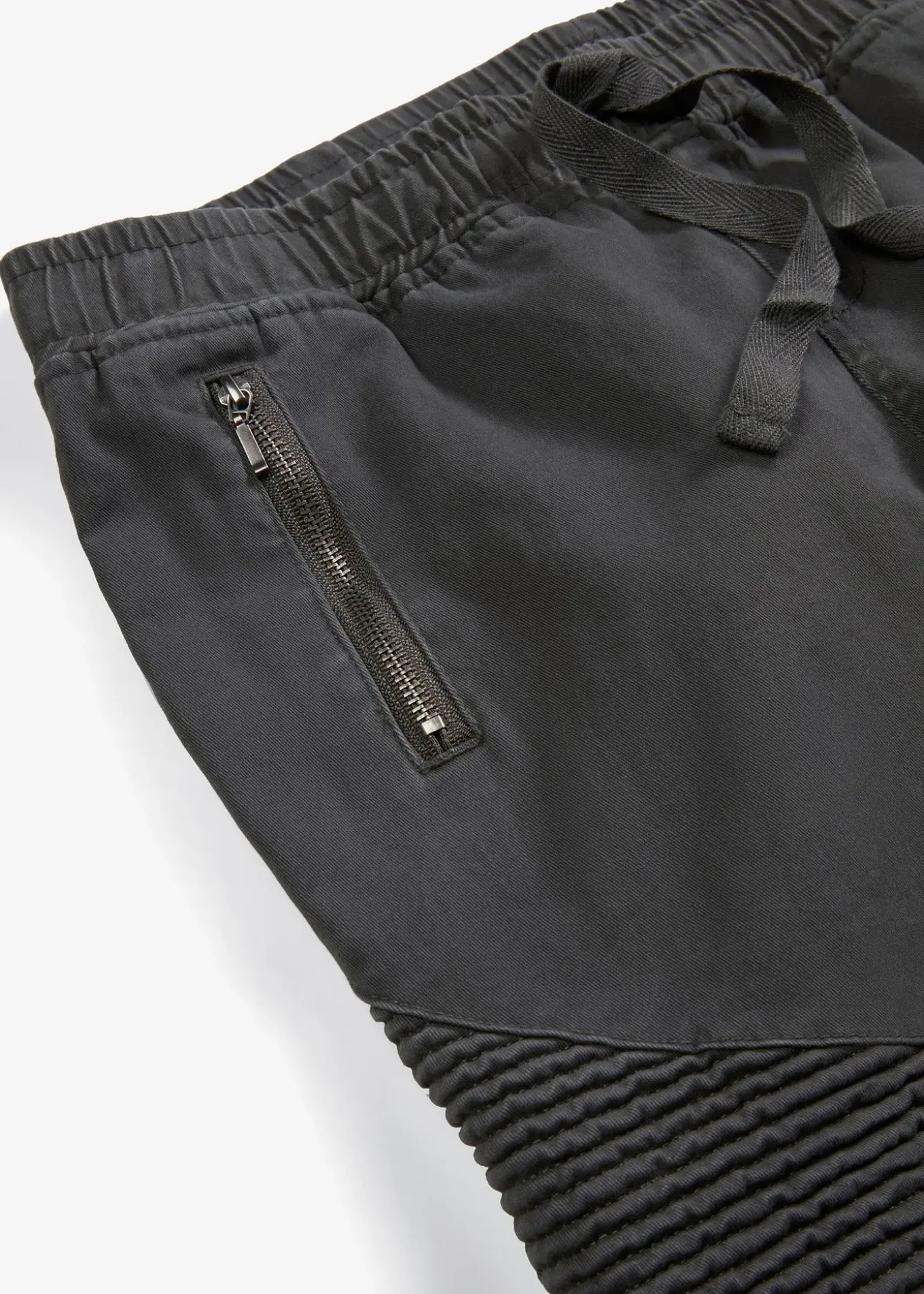 Pantalon de jogging tendance avec deux poches zippées sur le côté. Coutures nervurées au niveau des cuisses rappelant les pantalons de motard. Large bande élastiquée sur tout le pourtour avec un cordon à nouer à la taille et les bordures élastiquées au bas des jambes.