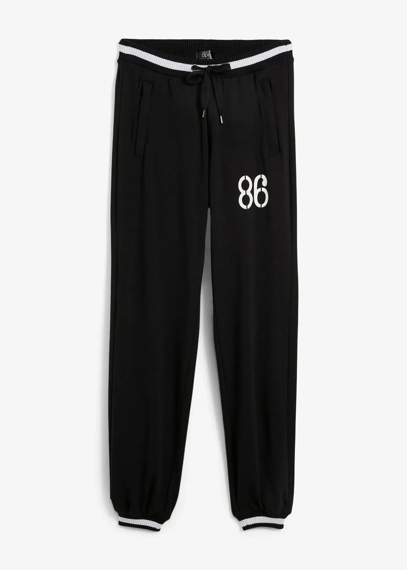 Pantalon de sport pour femme de la collection bpc. En jersey extensible, rayure blanche contrastante à la taille et au bas des jambes, finitions en bord-côtes. Taille extensible avec cordon de serrage. Deux poches latérales zippées devant. Chiffre imprimé côté gauche pour un look sportif. Long. entrejambe env. 79 cm.