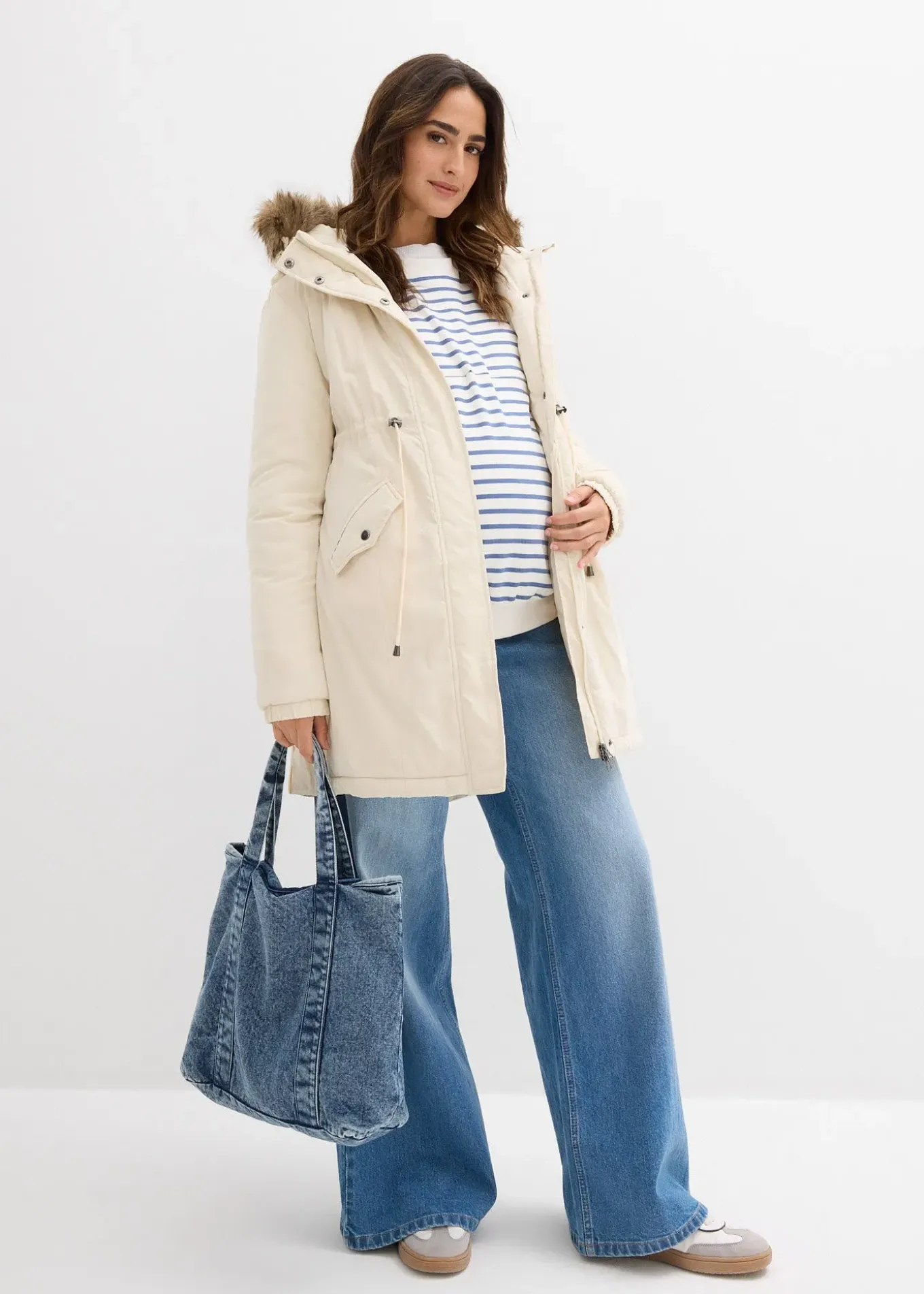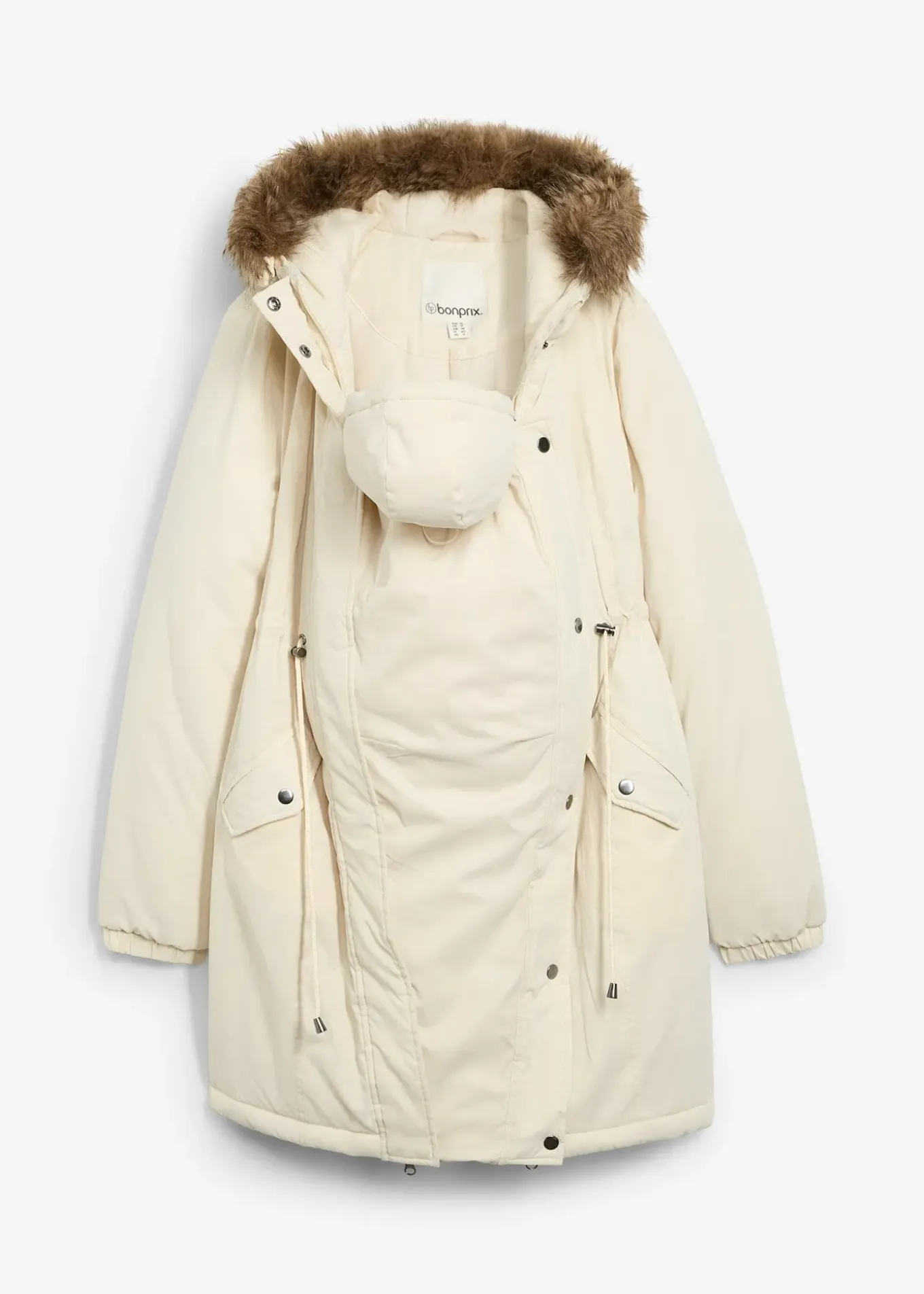 Parka de grossesse à fermetures zippées sur les côtés avec un empiècement de portage amovible avec capuche pour protéger le bébé du vent et des intempéries.
